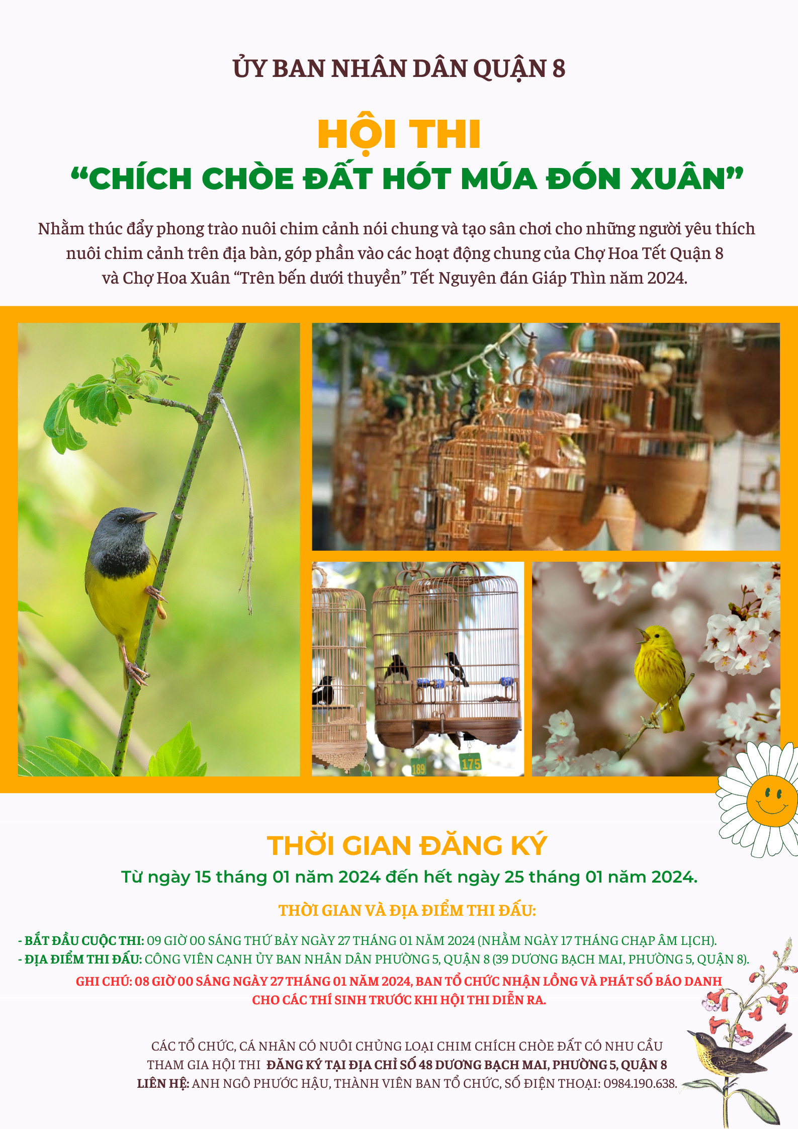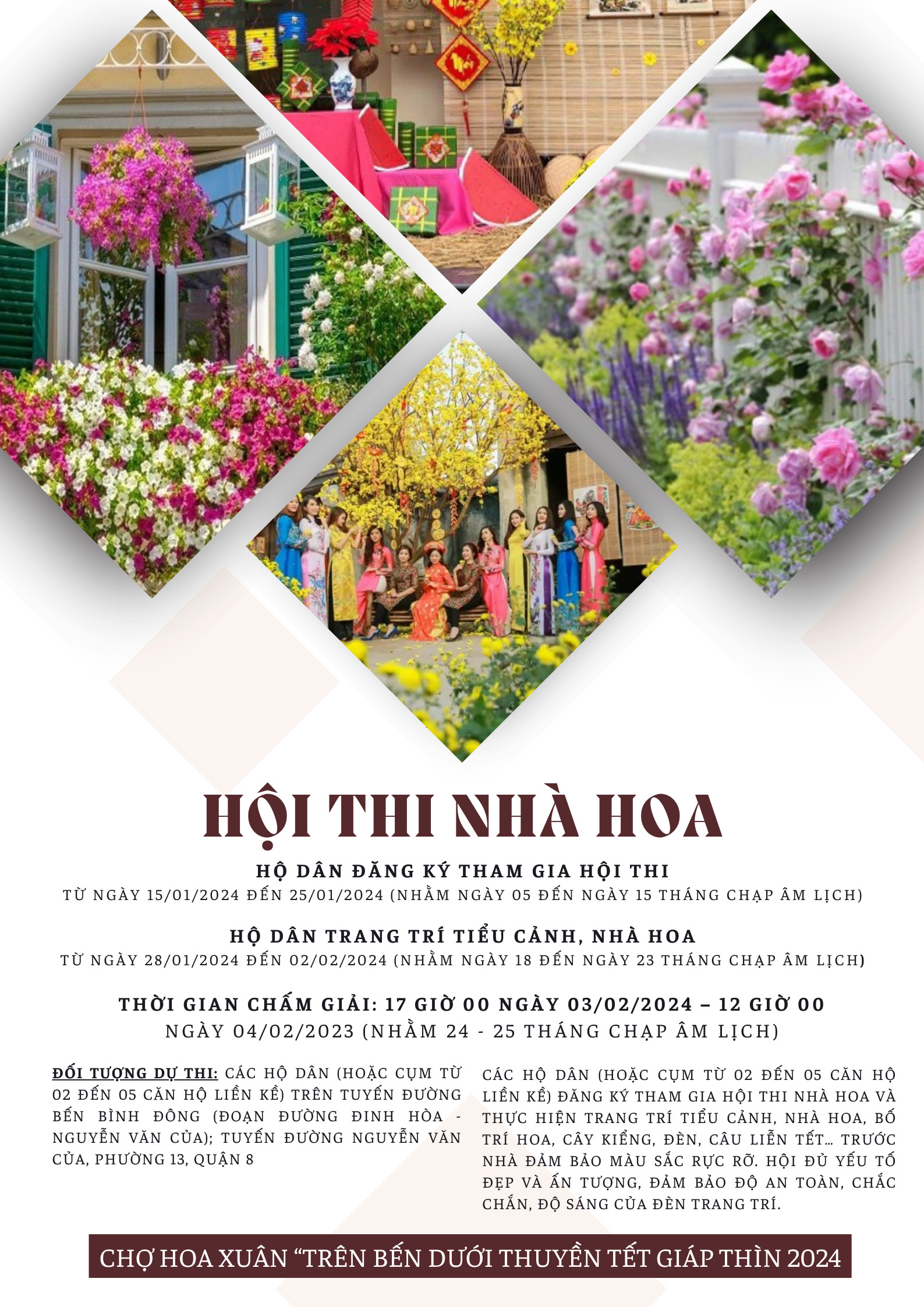 - Hoạt động Chợ Hoa Xuân càng thêm phong phú với các hội thi “Trang trí Nhà Hoa”; Hội thi làm mứt với chủ đề “Hương vị ngày Tết”; Hội thi “Chích chòe đất hót múa đón Xuân” lần 3 - năm 2024... nhằm xây dựng nét văn hóa truyền thống, tạo sân chơi cho người dân vui tết và lưu giữ những hình ảnh đẹp của ngày Tết Việt.