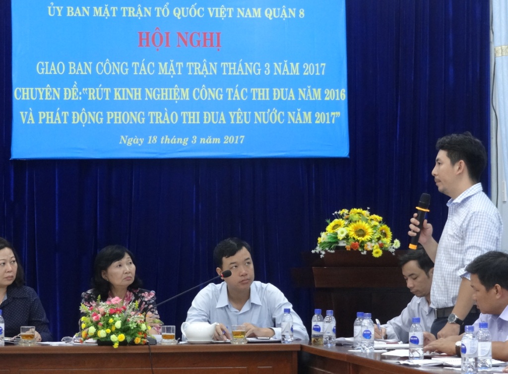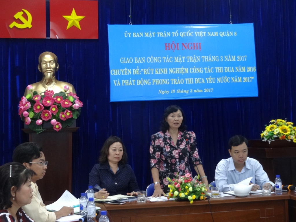 Nhằm nâng cao chất lượng công tác thi đua năm 2017, sáng ngày 18 tháng 3 năm 2017, Ban Thường trực Ủy ban Mặt trận Tổ quốc Việt Nam Quận 8 tổ chức hội nghị chuyên đề “Rút kinh nghiệm công tác thi đua năm 2016 và phát động phong trào thi đua yêu nước năm 2017”.