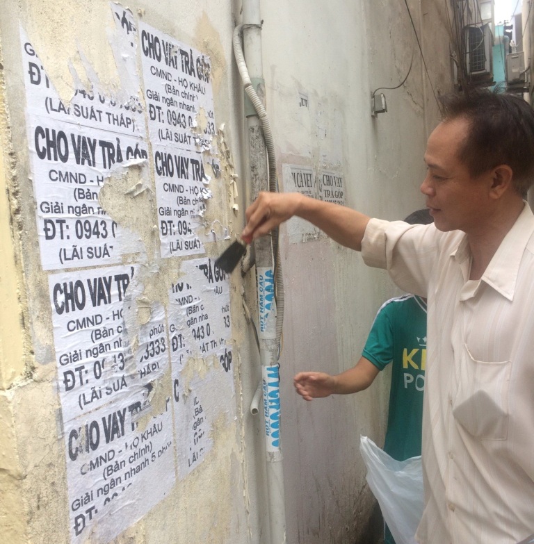 Thành viên Ban công tác Mặt trận khu phố 3 Phường 1 đang xóa biển quảng cáo sai quy định.