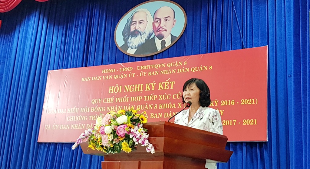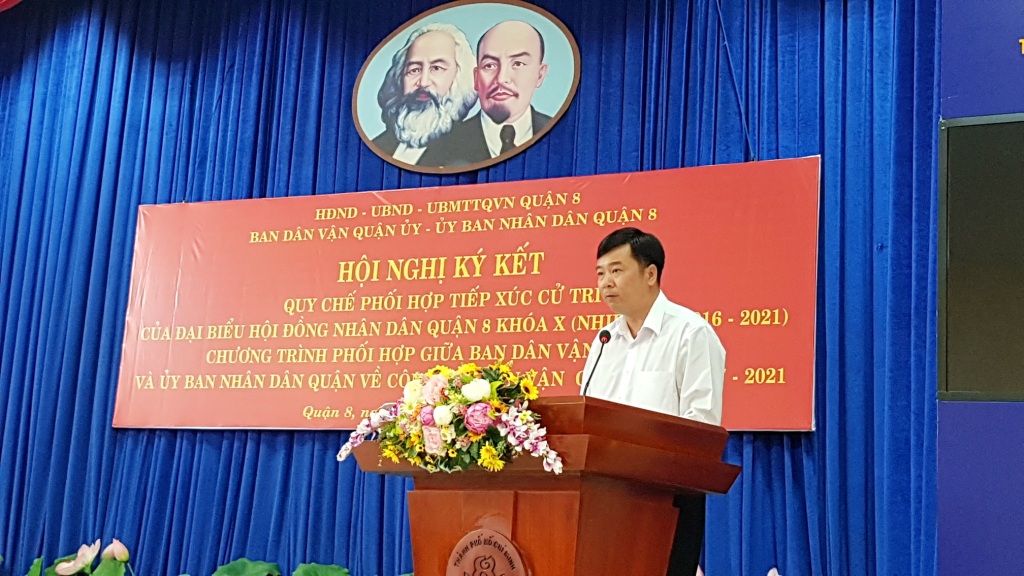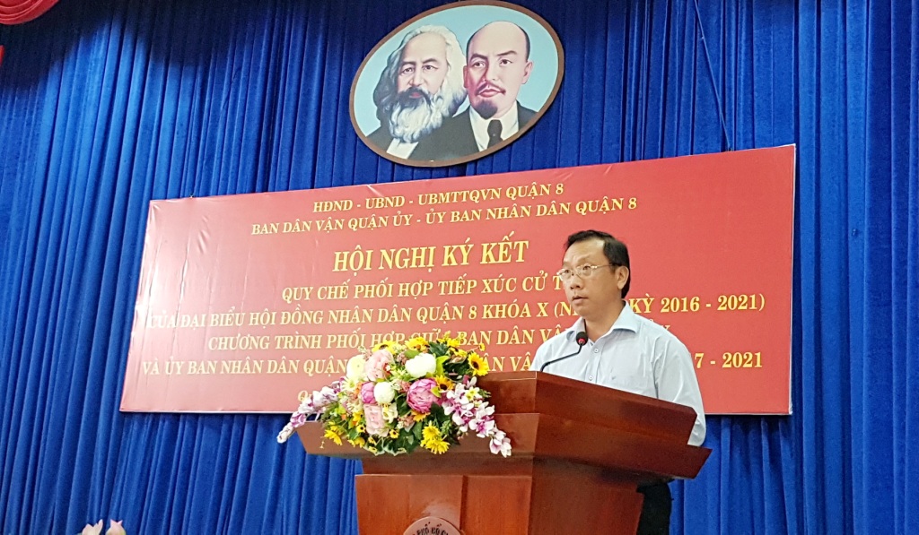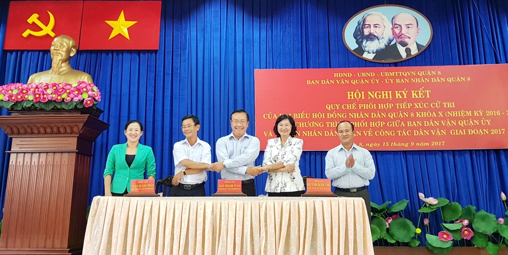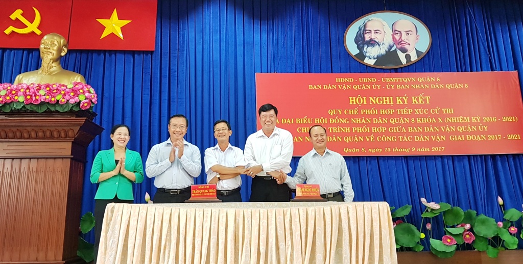 Sáng ngày 15 tháng 9 năm 2017, tại hội trường Quận ủy Quận 8 diễn ra hội nghị ký kết Quy chế tiếp xúc cử tri của đại biểu HĐND Quận 8 khóa X nhiệm kỳ 2016 - 2021; Chương trình phối hợp Ban Dân vận Quận ủy và Ủy ban nhân dân quận về công tác dân vận giai đoạn 2017 - 2021.