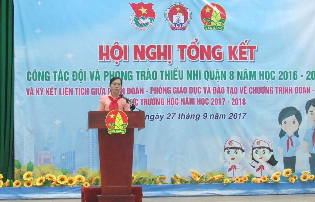Chiều 27/9, tại Hội trường Quận Đoàn Quận 8, Đoàn thanh niên Cộng sản Hồ Chí Minh quận đã tổ chức Hội nghị tổng kết công tác Đội và phong trào Thiếu nhi Quận 8 năm học 2016 - 2017 và ký kết liên tịch giữa Quận Đoàn - Phòng Giáo dục và Đào tạo quận về Chương trình Đoàn - Đội khu vực trường học năm học 2017 - 2018. Đến tham dự có các đồng chí: Nguyễn Trọng Nghĩa - Phó Ban Thiếu nhi Thành Đoàn, Chánh Văn phòng Hội đồng Đội Thành phố; đ/c Nguyễn Thanh Xuân - Phó Bí thư Quận ủy Quận 8.