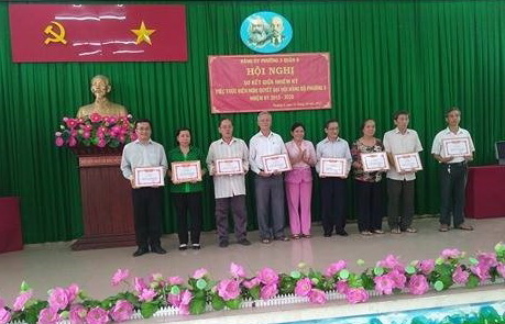 Đ/c: Nguyễn Thị Tính – Bí thư Đảng ủy – Chủ tịch UBND Phường 3 (bìa trái, thứ năm) trao giấy khen cho cá nhân có thành tích xuất sắc.