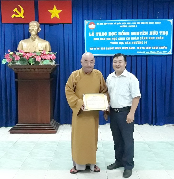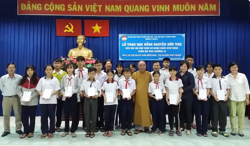 Tối 18/10, tại Nhà Văn hóa Phường, Ủy ban Mặt trận Tổ quốc - Ban Vận động Vì người nghèo Phường 14 đã tổ chức trao học bổng Nguyễn Hữu Thọ cho học sinh nghèo hiếu học. Đến dự có bà Trần Thị Thu Thủy, Phó Chủ tịch Ủy ban Mặt trận Tổ quốc Việt Nam Quận 8, về phía nhà tài trợ có Đại đức Thích Phước Hạnh, trụ trì chùa Thiên Trường cùng các ông bà đại diện các ban ngành đoàn thể phường cùng phụ huynh và 20 em học sinh được nhận học bổng đợt này.