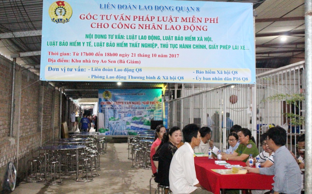 Qua khảo sát, nắm bắt nhu cầu của Công nhân lao động hiện đang sinh sống làm việc tập trung tại Khu Công nghiệp Phường 16 - Quận 8. Tối qua, ngày 21 tháng 10 năm 2017. Liên đoàn Lao động Quận 8 đã tổ chức lễ công bố quyết định và ra mắt các thành viên Tổ tư vấn pháp luật miễn phí phục vụ công nhân tại Khu Nhà trọ bà Nguyễn Thị Giám - Số 7 - Đường An Dương Vương - Phường 16 -Quận 8.
