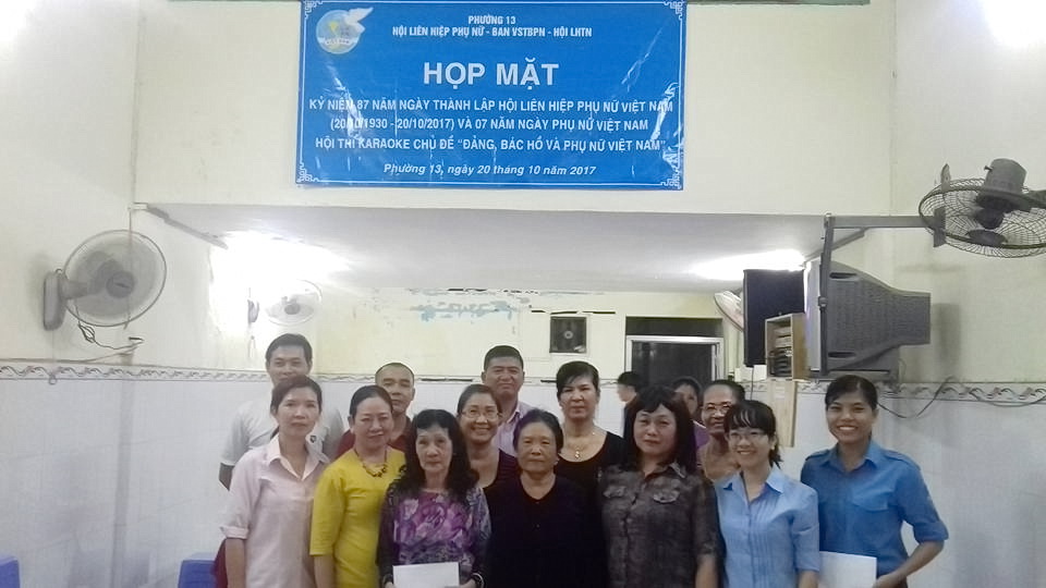 Tối ngày 20/10/2017 tại Trung tâm học tập cộng đồng Phường 13 (số 515 Bến Bình Đông Phường 13 Quận 8), Ban Chấp hành Hội Liên hiệp Phụ nữ Phường 13 đã phối hợp với Ban Vì sự tiến bộ phụ nữ Phường 13 long trọng tổ chức buổi họp mặt kỷ niệm 87 năm ngày thành lập Hội Liên hiệp Phụ nữ Việt Nam (20/10/1930 – 20/10/2017), 07 năm ngày Phụ nữ Việt Nam (20/10/2010 – 20/10/2017) và hội thi hát Karaoke với chủ đề “Đảng, Bác Hồ và phụ nữ Việt Nam”. Đến dự buổi họp mặt có bà Quách Thị Kim Phượng – Quận ủy viên, Chủ tịch Hội Liên hiệp Phụ nữ Quận 8, ông Huỳnh Anh Tuấn – Đảng ủy viên, Phó chủ tịch Hội đồng nhân dân Phường 13, ông Thái Vĩnh Viễn – Đảng ủy viên, Phó Chủ tịch Ủy ban nhân dân, Trưởng Ban Vì sự tiến bộ phụ nữ Phường 13 cùng với hơn 60 chị là cán bộ, hội viên phụ nữ trên địa bàn phường.