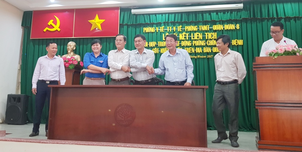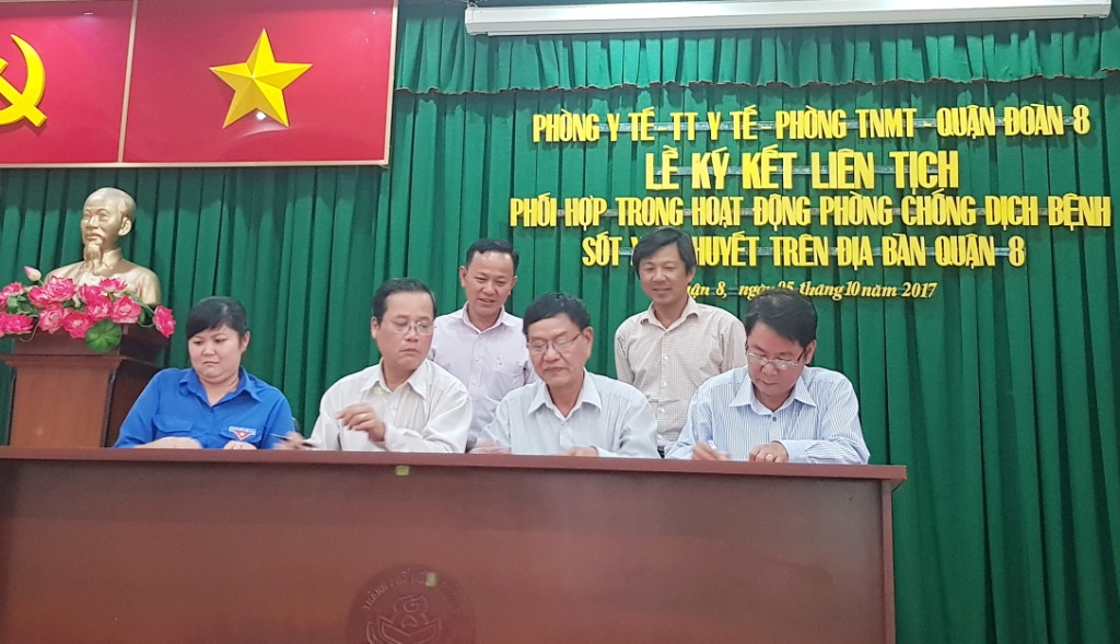 Thực hiện Kế hoạch liên tịch số 7451/KHLT-SYT-STNMT-TĐ ngày 24 tháng 8 năm 2017 của Sở Y tế - Sở Tài nguyên và Môi trường - Thành đoàn Thành phố Hồ Chí Minh về phối hợp trong hoạt động diệt lăng quăng phòng, chống dịch bệnh Sốt xuất huyết trên địa bàn Thành phố Hồ Chí Minh. Nhằm thực hiện tốt hoạt động kiểm soát các điểm nguy cơ là bãi đất trống, khu quy hoạch, công viên, nơi công cộng có khả năng phát sinh muỗi, lăng quăng làm phát sinh dịch bệnh Sốt xuất huyết; tăng cường giám sát chặt chẽ, phát hiện sớm, đáp ứng nhanh và xử lý triệt để các điểm nguy cơ trên địa bàn quận; đẩy mạnh các biện pháp xử phạt hành chính nhằm xử lý quyết liệt những trường hợp không thực hiện hành vi giảm nguồn sinh sản của muỗi gây lây truyền dịch bệnh; huy động nguồn lực cộng đồng trong phòng chống dịch bệnh trên địa bàn, ngày 05 tháng 10 năm 2017, Phòng Y tế, Trung tâm Y tế, Phòng Tài nguyên và Môi trường, Quận Đoàn Quận 8 tổ chức ký kết liên tịch phối hợp trong hoạt động diệt lăng quăng phòng chống dịch bệnh Sốt xuất huyết trên địa bàn Quận 8. Tham dự lễ ký kết: ông Nguyễn Trí Dũng - Giám đốc Trung tâm Y tế dự phòng thành phố Hồ Chí Minh; Ông Nguyễn Thanh Sang - Quận ủy viên, Phó Chủ tịch Ủy ban nhân dân Quận 8; Ông Đặng Thế Hệ - Giám đốc Trung tâm Y tế Quận 8; Ông Ngô Thanh Hiền - Trưởng Phòng Y tế Quận 8; ông Nguyễn Hồng Lam - Phó Trưởng phòng Tài nguyên - môi trường Quận 8; bà Lương Hoàng Bích Trâm - Bí thư Quận đoàn 8; thành viên Ban Chỉ đạo Chăm sóc sức khỏe nhân dân Quận 8 cùng Bí thư Đảng ủy - Chủ tịch Ủy ban nhân dân, Bí thư Đoàn thanh niên, Trưởng Ban Chăm sóc sức khỏe nhân dân, Trưởng Trạm Y tế 16 phường.