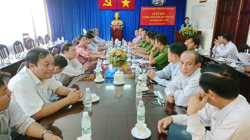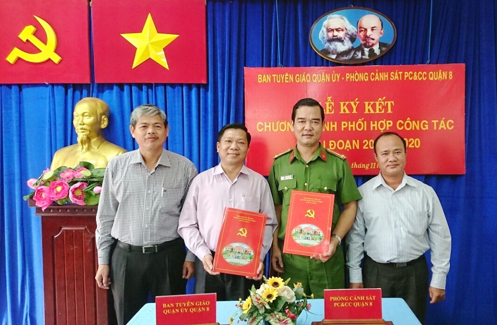 Sáng ngày 17/11/2017, Lễ ký kết Chương trình phối hợp công tác giai đoạn 2016 - 2020 giữa Phòng Cảnh sát PC&CC Quận 8 và Ban Tuyên giáo Quận ủy Quận 8 đã diễn ra tại Hội trường Quận ủy Quận 8, số 2 Dương Quang Đông, Phường 5, Quận 8. Đến dự có đồng chí Đỗ Hữu Trí – Phó Bí thư thường trực Quận ủy Quận 8, đồng chí Lê Huỳnh Đài – Phó Chủ tịch thường trực Ủy ban nhân dân Quận 8, đồng chí Trương Công Hồ - Phó Trưởng ban thường trực Ban Tuyên giáo Quận ủy Quận 8, đồng chí Thượng tá Phạm Trí Thảo – Trưởng Phòng Cảnh sát PC&CC Quận 8 và cán bộ thuộc Ban Tuyên giáo, Ban Chỉ huy các đội thuộc Phòng Cảnh sát PC&CC Quận 8.