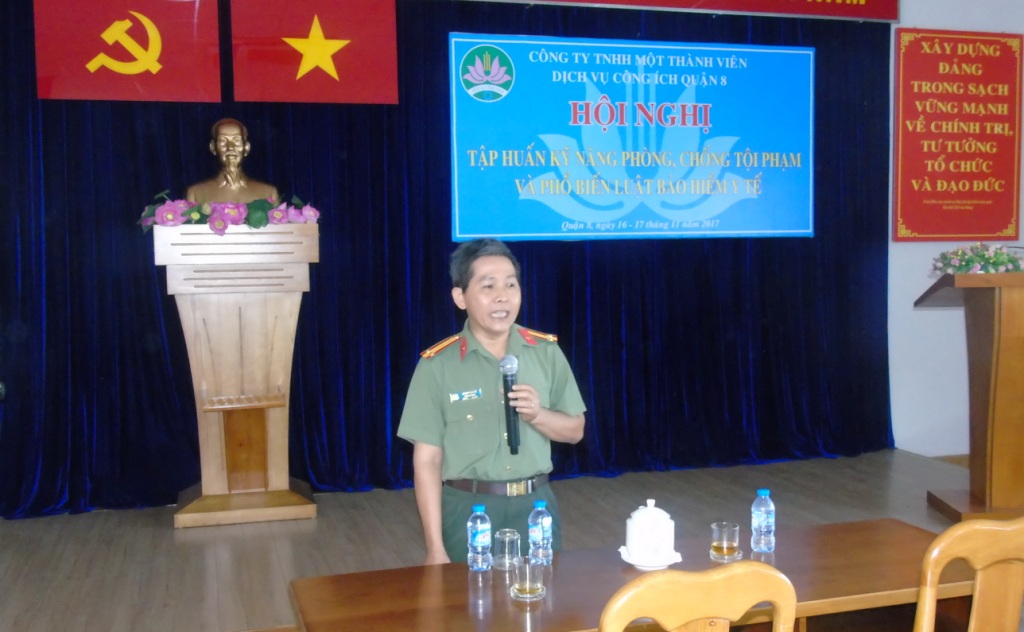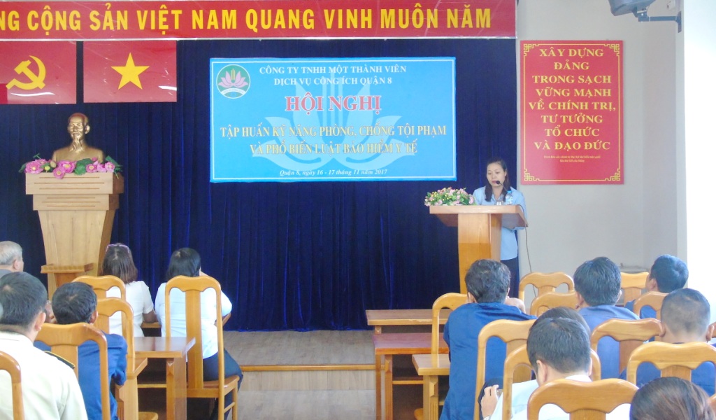 Sáng ngày 16-17/11/2017 Công ty TNHH MTV Dịch vụ công ích Quận 8 phối hợp với Công an Quận 8 tổ chức Hội nghị “Tập huấn kỹ năng phòng, chống tội phạm và phổ biến luật bảo hiểm y tế”. Tại văn phòng Công ty TNHH MTV dịch vụ công ích Quận 8. Tham dự có đồng chí Trung tá Lê Hữu Nghĩa – Đội trưởng Đội 3 Phòng Xây dựng phong trào toàn dân bảo vệ an ninh -Tổ quốc Công an Thành phố, làm báo cáo viên tập huấn mô hình “ Tổ công nhân đường phố phòng, chống tội phạm” năm 2017 và khoảng 200 công nhân