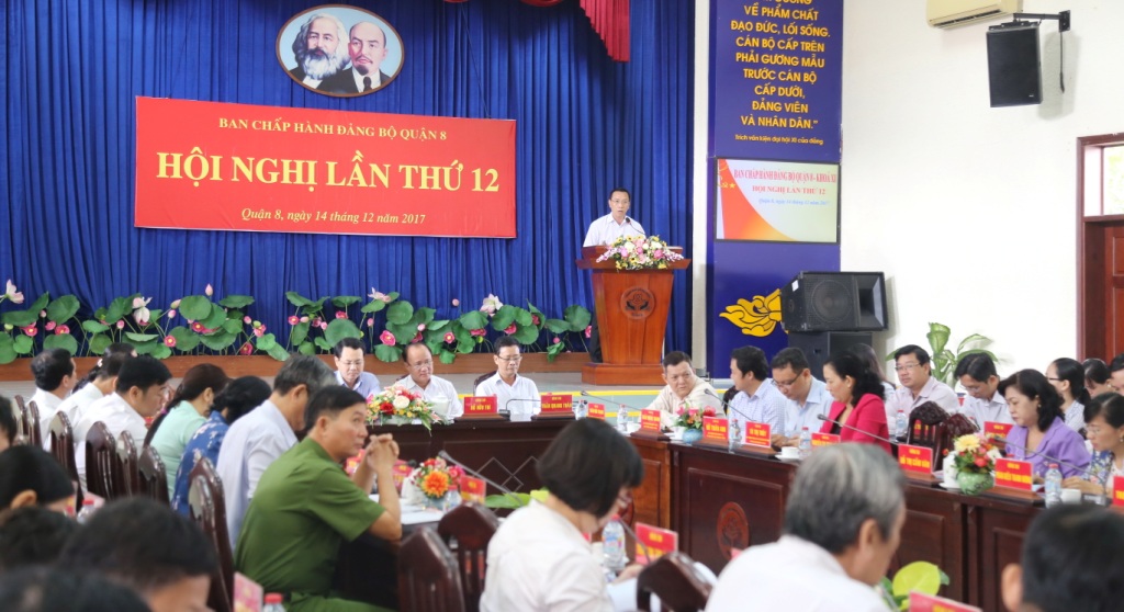 Ngày 14 tháng 12 năm 2017, Ban Chấp hành Đảng bộ Quận 8 khoá XI đã tiến hành kỳ họp thứ 12 nhằm kiểm điểm việc thực hiện nhiệm vụ phát triển kinh tế, văn hóa - xã hội, quốc phòng - an ninh, công tác xây dựng Đảng, xây dựng chính quyền, công tác dân vận năm 2017, bàn các giải pháp hoàn thành các nhiệm vụ, chỉ tiêu về thực hiện nhiệm vụ đề ra năm 2018. Hội nghị trân trọng đón tiếp đồng chí Nguyễn Văn Hiếu - Ủy viên dự khuyết Trung ương Đảng, Ủy viên Ban Thường vụ Thành ủy, Chủ nhiệm Ủy ban kiểm tra Thành ủy tham dự đồng thời phát biểu chỉ đạo qua đó, cho chúng ta có cái nhìn tổng quan, rõ nét hơn về những mặt làm được, chưa được trong triển khai thực hiện nhiệm vụ thời gian qua và đề ra phương hướng thực hiện nhiệm vụ trong thời gian tới.