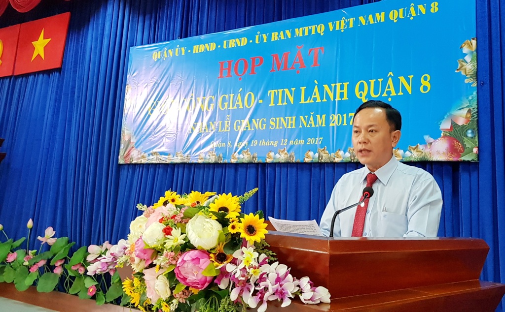 Thay mặt Quận ủy - Hội đồng nhân dân - Ủy ban nhân dân - Ủy ban Mặt trận Tổ quốc Việt Nam Quận 8, Nguyễn Thanh Sang - Quận ủy viên, Phó Chủ tịch Ủy ban Nhân dân Quận 8 phát biểu chúc mừng Giới Công giáo và Tin lành trong năm tích cực tham gia các hoạt động xã hội từ thiện, với số tiền trên 3 tỷ đồng. Đồng thời, thông tin tình hình kinh tế, văn hóa, xã hội, quốc phòng - an ninh trên địa bàn quận năm 2017 và mong quý vị chức sắc, chức việc đạo Công giáo và Tin Lành, cùng giáo dân tiếp tục đóng góp công sức vào sự phát triển của địa phương theo định hướng sống “tốt đời, đẹp đạo”. Đồng thời, cũng đánh giá cao và ghi nhận những đóng góp tích cực của Giới Công giáo, Tin lành trên địa bàn quận đối với sự phát triển chung của quận trong những năm qua và mong quý vị chức sắc, chức việc tiếp tục gắn bó với chính quyền, Mặt trận và vận động các tín đồ, phật tử tham gia tích cực các phong trào, các cuộc vận động tại địa phương, góp phần xây dựng Quận 8 ngày càng phát triển, văn minh, hiện đại, nghĩa tình và chúc mừng Giới Công giáo - Tin Lành một mùa Giáng sinh vui vẻ, an lành, hạnh phúc và một năm mới an khang thịnh vượng.