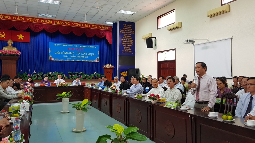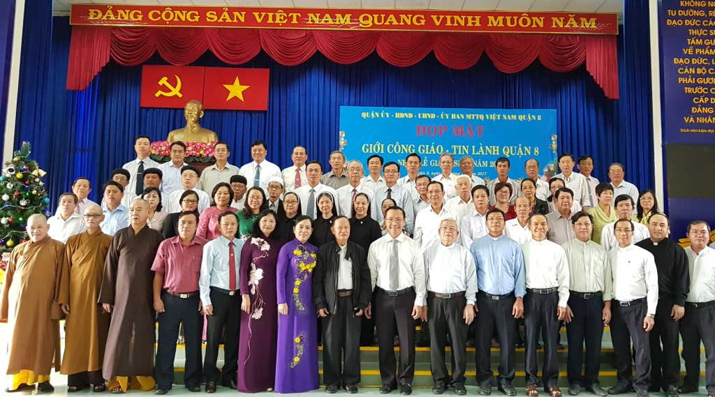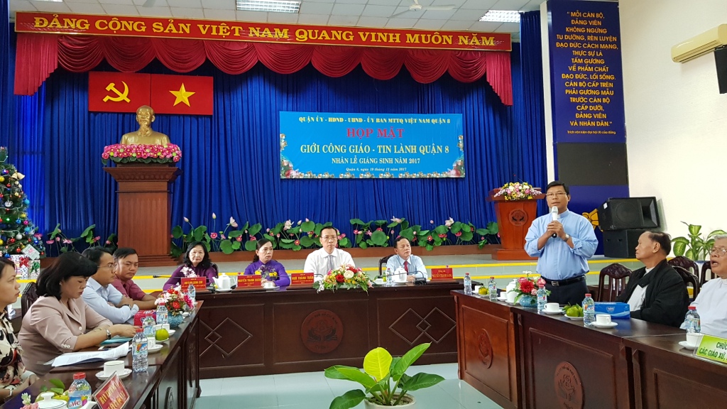 Sáng ngày 19/12/2017, Quận ủy - Hội đồng nhân dân - Ủy ban nhân dân - Ủy ban Mặt trận Tổ quốc Việt Nam quận 8 tổ chức họp mặt quý vị chức sắc, chức việc đạo Công giáo - Tin lành trên địa bàn quận 8 nhân Lễ Giáng sinh năm 2017, qua đó tạo sự gắn bó, giao lưu giữa lãnh đạo quận 8 và quý vị chức sắc, chức việc đạo Công giáo và đạo Tin lành; động viên các vị chức sắc, chức việc đạo Công giáo, Tin lành và các tôn giáo trên địa bàn tiếp tục vận động giáo dân, tín đồ tham gia các phong trào thi đua yêu nước, các phong trào, các cuộc vận động của địa phương.