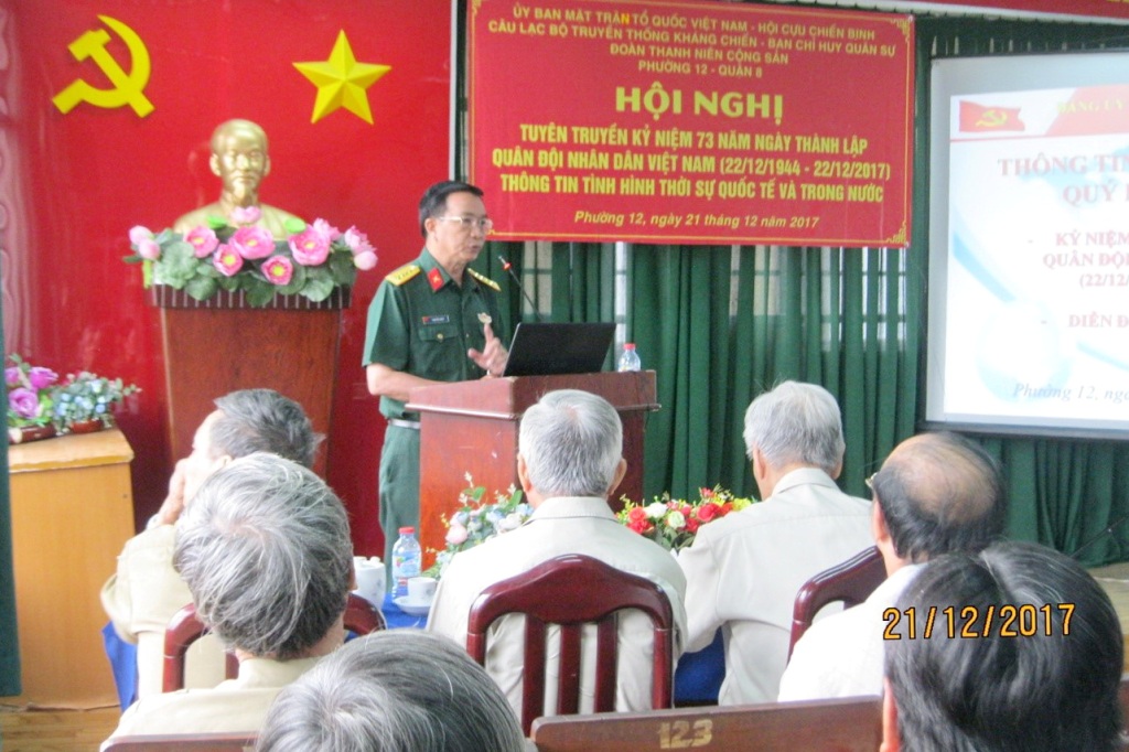 Sáng ngày 21 tháng 12 năm 2017, được sự chấp thuận của Thường trực Đảng ủy Phường 12, Ban Thường trực Uỷ ban Mặt trận Tổ quốc Việt Nam phối hợp cùng Hội Cựu chiến binh, câu lạc bộ Truyền thống kháng chiến, Ban chỉ huy Quân sự, Đoàn Thanh niên Phường tổ chức tuyên truyền kỷ niệm 73 năm ngày thành lập Quân đội nhân dân Việt Nam 22/12/1944 – 22/12/2017 và thông tin tình hình thời sự trong nước và quốc tế tại Hội trường Ủy ban nhân dân phường.