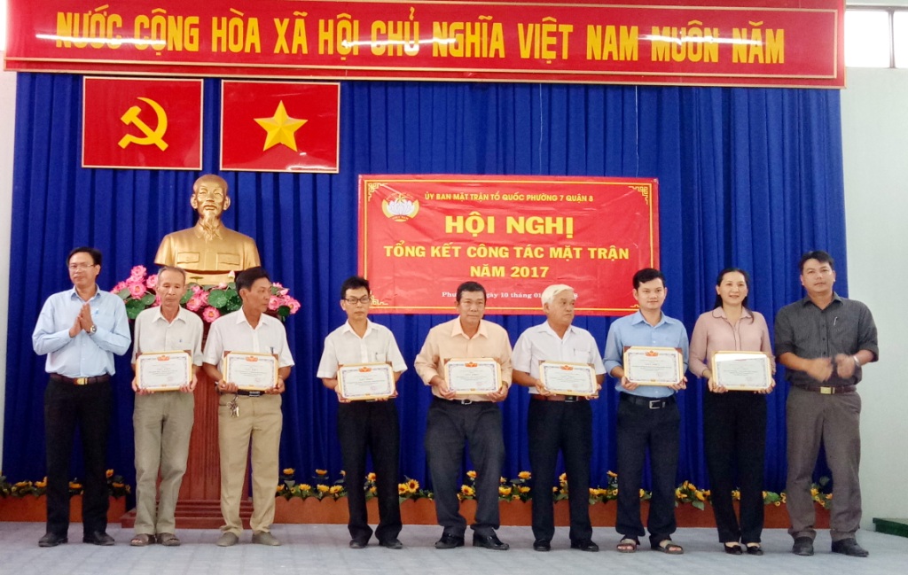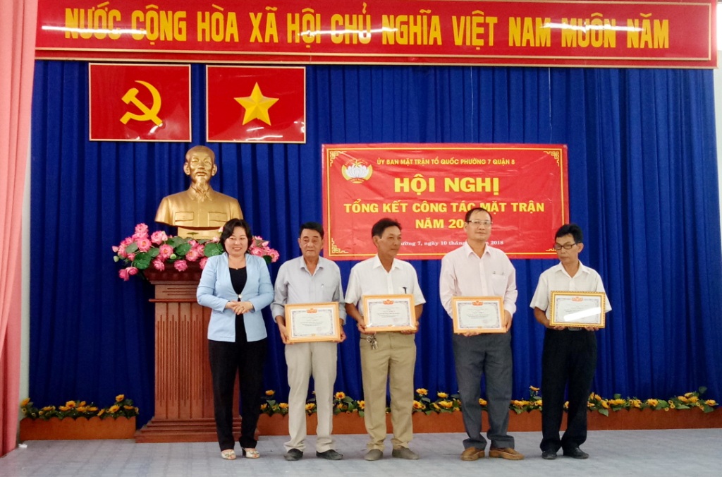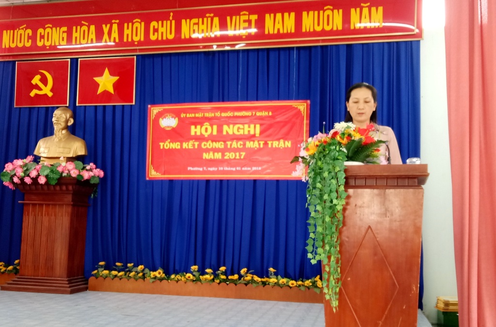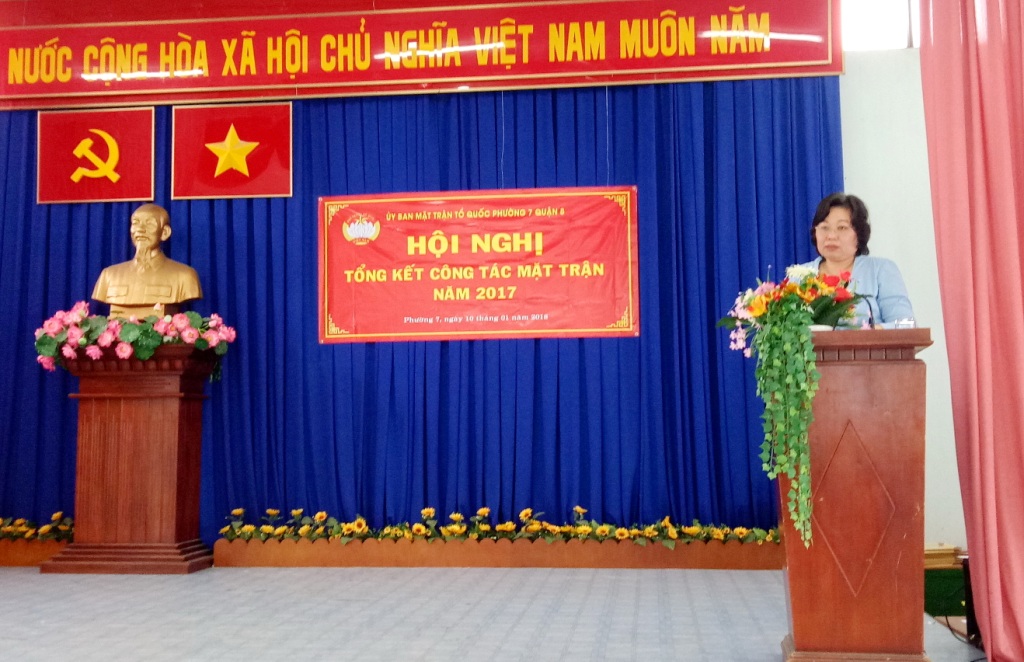 Chiều ngày 10 tháng 01 năm 2018, Ủy ban Mặt trận Tổ quốc phường 7 tổ chức Hội nghị tổng kết công tác mặt trận năm 2017, tại Hội trường Nhà văn hóa phường 7. Đến dự Hội nghị có Bà Trần Thị Thu Thủy – Phó chủ tịch Ủy ban Mặt trận Tổ quốc Quận 8; Ông Lê Phước Thật – Phó bí thư Thường trực Đảng ủy phường 7; Bà Nguyễn Thị Nhài – Đảng ủy viên, Phó chủ tịch UBND phường 7; Ông Phí văn Thịnh – Đảng ủy viên, Chủ tịch Ủy ban MTTQ phường 7 cùng các ông bà đại diện các ban nghành đoàn thể phường, Bí thư chi bộ, Trưởng khu phố, Trưởng ban Ban công tác Mặt trận 06 khu phố cùng một số hộ dân về tham dự.