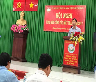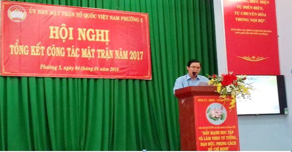 Ông Lê Thanh Tú - Ủy viên Ban Thường vụ Đảng ủy, Chủ tịch Ủy ban Mặt trận Tổ quốc Việt Nam Phường 2 thay mặt Ban Thường trực Ủy ban Mặt trận Tổ quốc Việt Nam Phường 2 trình bày báo cáo công tác Mặt trận năm 2017 và triển khai Chương trình công tác Mặt trận năm 2018. Trong năm 2017, Mặt trận Tổ quốc Việt Nam Phường 2 luôn là nòng cốt trong việc xây dựng và củng cố khối đoàn kết toàn dân; phát động nhân dân thực hiện phong trào thi đua yêu nước trong lao động, sản xuất, kinh doanh, giảm nghèo bền vững, bảo vệ an ninh chính trị, trật tự an toàn xã hội…Các phong trào, các cuộc vận động tại địa phương đã và đang đưa lại hiệu quả thiết thực như: Cuộc vận động “Toàn dân đoàn kết xây dựng nông thôn mới, đô thị văn minh”; Cuộc vận động “Vì người nghèo” như: vận động nhân dân đóng góp quỹ “Vì người nghèo”vượt chỉ tiêu quận giao, sửa chữa chống dột cho hộ nghèo; chăm lo học bổng Nguyễn Hữu Thọ; vận động nhân dân đóng góp quỹ “Vì biển, đảo quê hương - Vì tuyến đầu Tổ quốc”, đóng góp ủng hộ đồng bào Miền Bắc, Miền Trung bị thiên tai, bão lũ; phong trào “3 tiết kiệm, 3 tương trợ”, hộ khá giúp hộ khó khăn, vận động chủ nhà trọ không tăng tiền thuê nhà đối với học sinh, sinh viên, công nhân lao động, không tăng giá điện, nước quá mức định, vận động nhân dân đóng góp kinh phí nâng cấp hẻm, lắp đặt Camera an ninh, thực hiện công tác giám sát theo Quyết định 217-QĐ/TW của Bộ Chính trị,...Qua đó đã góp phần đảm bảo an sinh xã hội, giữ vững an ninh chính trị, xây dựng Đảng, xây dựng Chính quyền trong sạch, vững mạnh, phát triển kinh tế - văn hóa - xã hội tại địa phương.