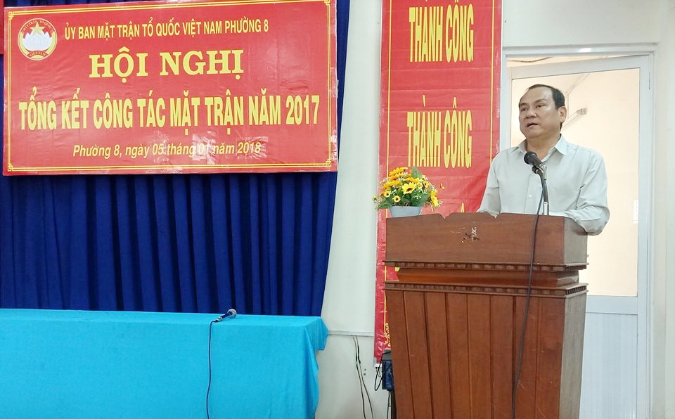 Chiều ngày 05/01/2018, Ủy ban Mặt trận Tổ quốc Việt Nam Phường 8 tổ chức tổng kết công tác Mặt trận năm 2017, nhằm đánh giá những kết quả đã đạt được trong năm 2017 và đề ra các nhiệm vụ trọng tâm cần thực hiện trong năm 2018. Hội nghị tổng kết có 29/31 Ủy viên Ủy ban MTTQ Việt Nam phường tham dự cùng các tổ chức thành viên và đại diện Cấp ủy chi bộ, Ban Điều hành, Ban Công tác Mặt trận 04 khu phố cùng tham dự.