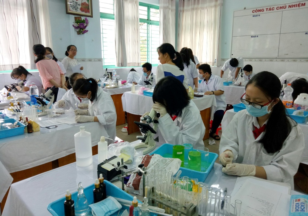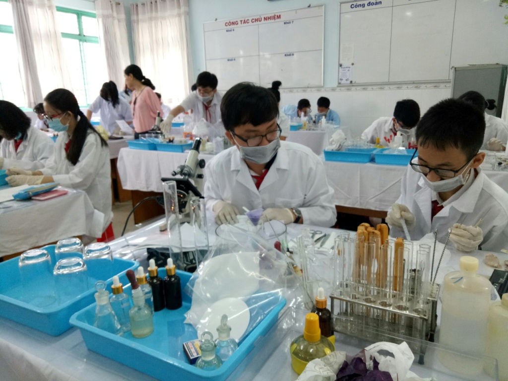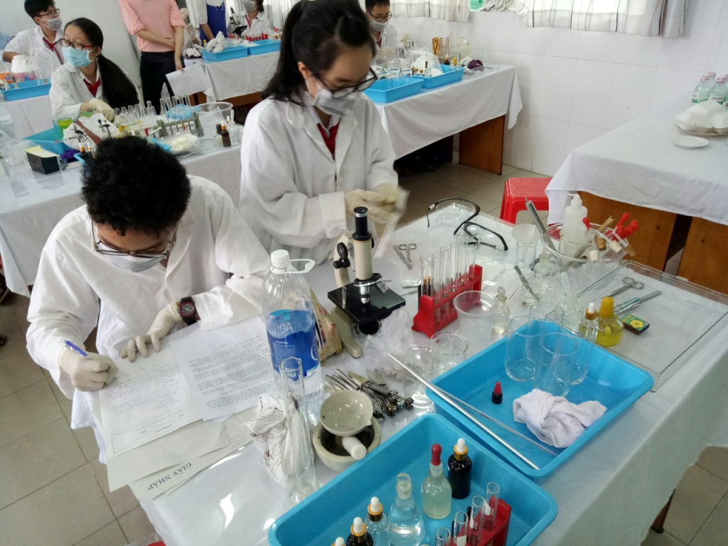 Học sinh thực hiện các thao tác thí nghiệm để hoàn thành bài dự thi của mình.