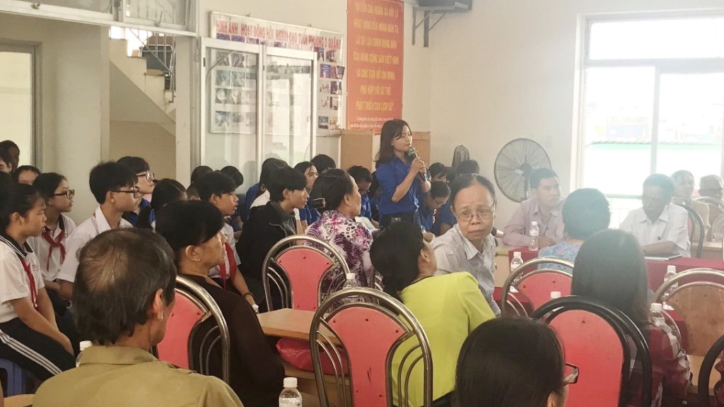 Đoàn viên Trần Thị Hà – Chi đoàn trường THCS Khánh Bình đặt câu hỏi cho các Bác từng tham gia trận đánh.