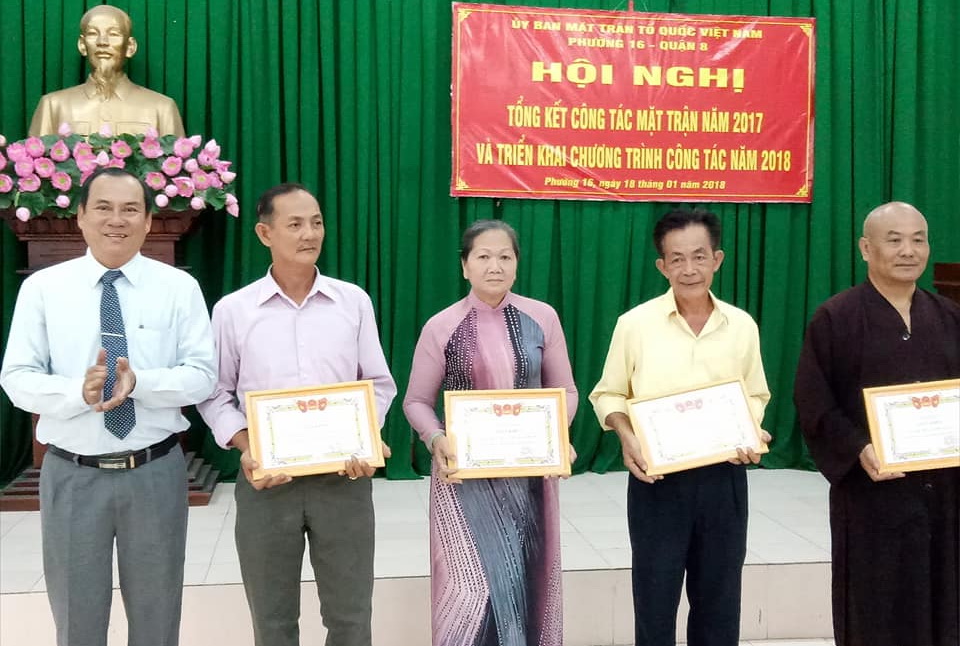 Chiều 18/01, Ban Thường trực Ủy ban Mặt trận Tổ quốc Việt Nam Phường 16 tổ chức Hội nghị tổng kết công tác Mặt trận năm 2017 và triển khai công tác năm 2018. Về dự hội nghị có ông Mai Hồng Phong, Phó Chủ tịch Thường trực Ủy ban Mặt trận Tổ quốc Việt Nam Quận 8; ông Lê Minh Thông, Quận ủy viên, Bí thư Đảng ủy; bà Huỳnh Thị Anh Minh, Phó Bí thư Thường trực Đảng ủy, Chủ tịch Hội đồng nhân dân; ông Nguyễn Thành Nam, Phó Bí thư, Chủ tịch Ủy ban nhân dân; các vị trong Thường trực Hội đồng nhân dân, Ủy ban nhân dân, Ủy ban Mặt trận Tổ quốc Việt Nam phường; đại diện các chức sắc, chức việc các tôn giáo; cấp ủy, ban công tác mặt trận khu phố.