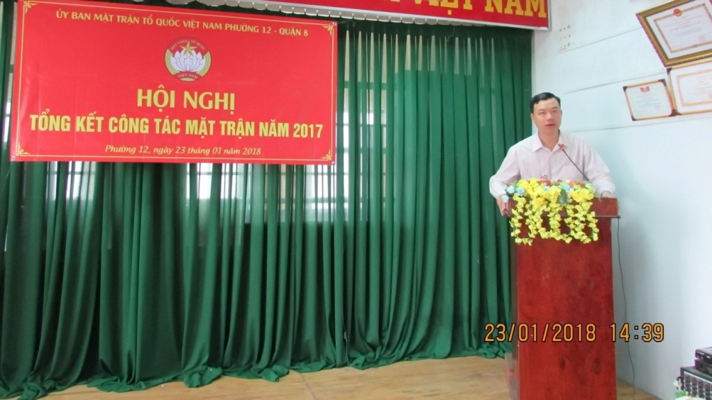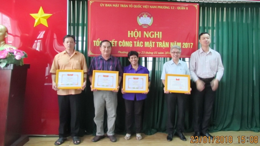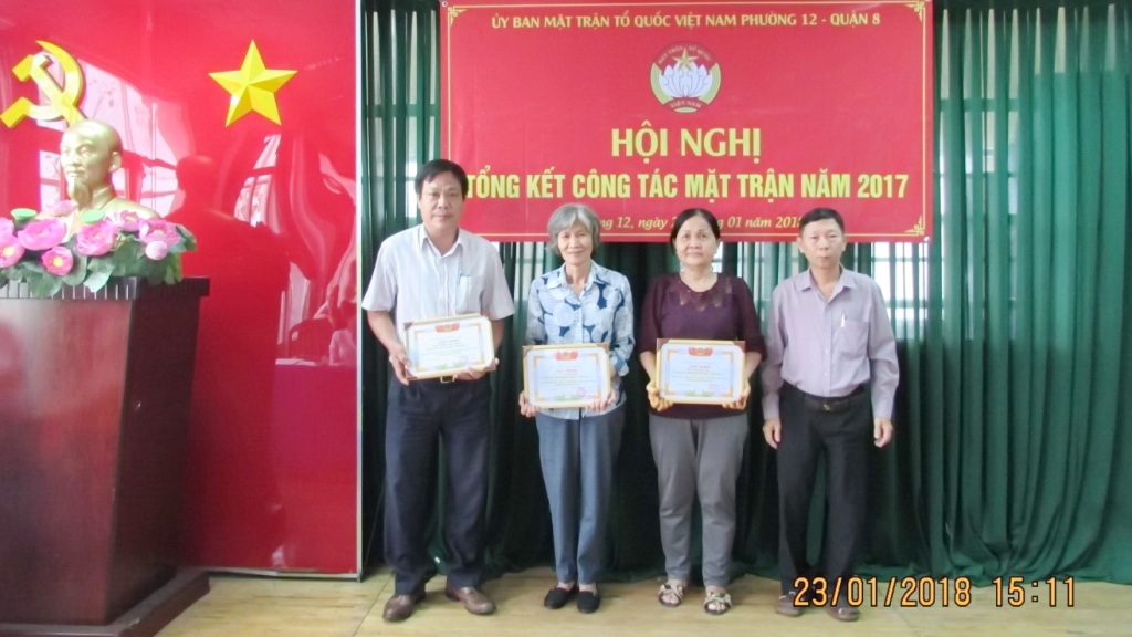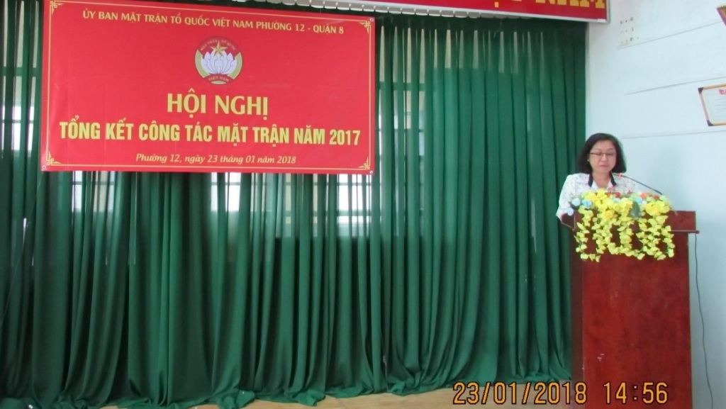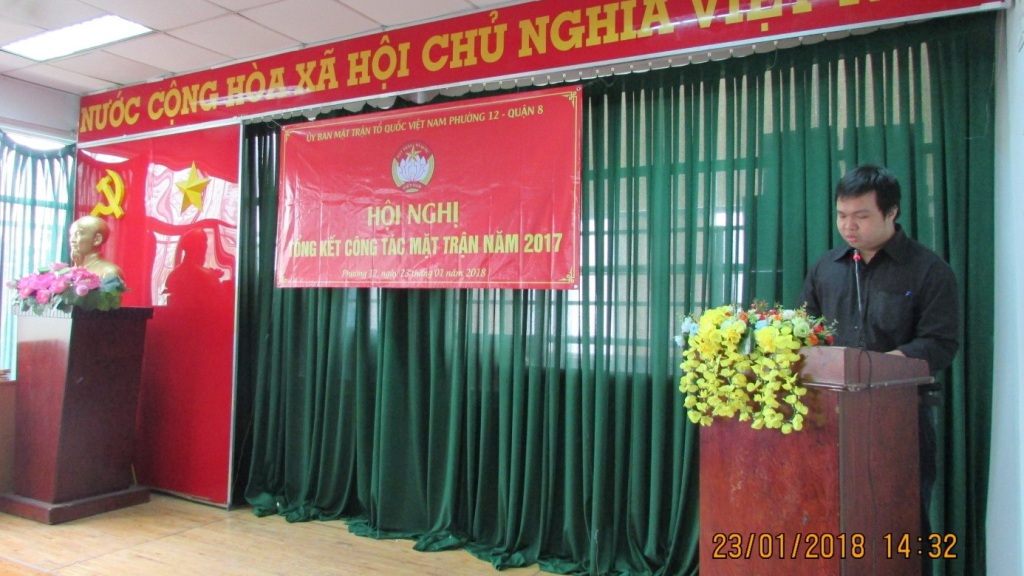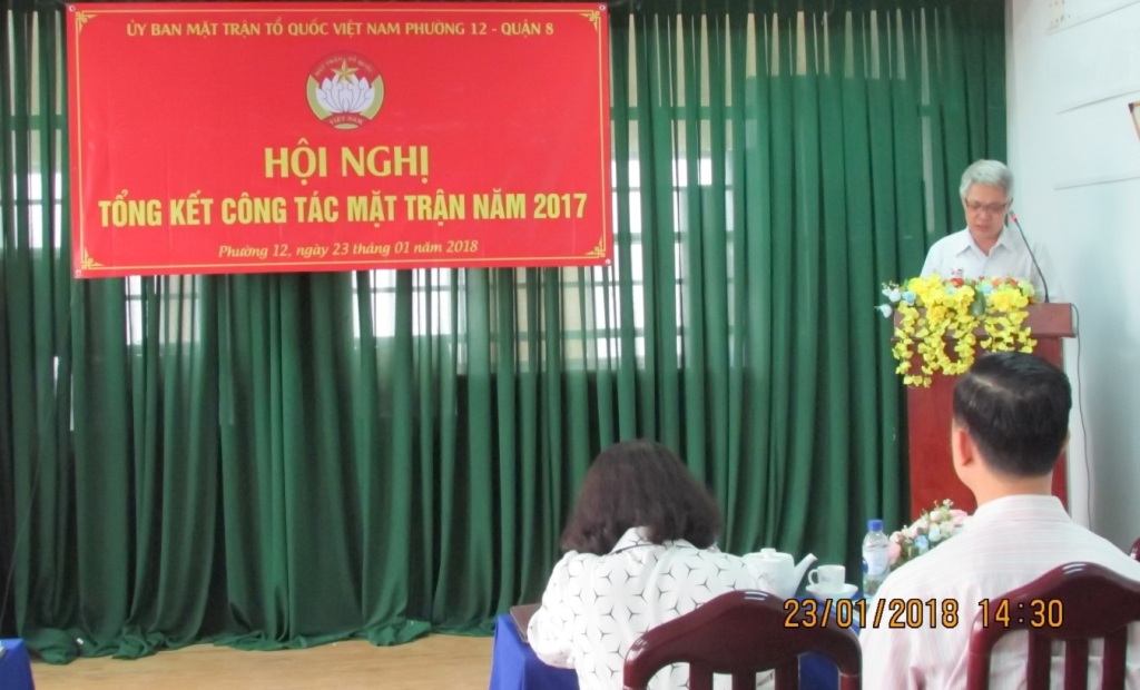 Được sự chấp thuận của Ban Thường trực Ủy ban Mặt trận Tổ quốc Việt Nam Quận 8, Thường trực Đảng ủy Phường 12. Vào lúc 14 giờ, ngày 23 tháng 01 năm 2018, Ban Thường trực Uỷ ban Mặt trận Tổ quốc Việt Nam Phường 12 tổ chức Hội nghị tổng kết công tác Mặt trận năm 2017.