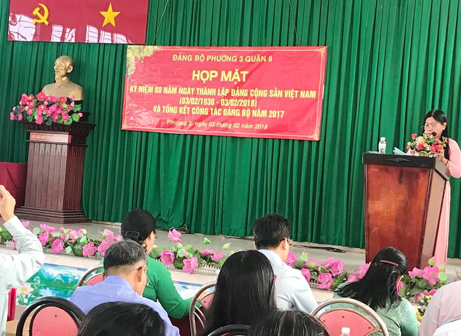 Đ/c: Nguyễn Thị Tính – Bí thư Đảng ủy – Chủ tịch UBND P3 ôn lại kỷ niệm 88 năm ngày thành lập Đảng Cộng Sản Việt Nam (3/2/1930 – 3/2/2018). Tiếp theo, đ/c: Lê Thị Mai Phương – Phó bí thư Thường trực Đảng ủy P3 báo cáo tóm tắt kết quả thực hiện nhiệm vụ chính trị năm 2017. Qua đó, thấy được Đảng bộ Phường đã đạt được những kết quả đáng kể trên các lĩnh vực như: Công tác xây dựng Đảng, xây dựng Chính quyền, công tác Dân vận và xây dựng hệ thống Chính trị xuất sắc vững mạnh từ phường đến khu phố. Cuối cùng, đ/c: Huỳnh Bá Hiếu – Phó bí thư Đảng ủy Phường 3 – Chủ tịch Hội đồng nhân dân P3 thông qua Nghị Quyết năm 2018 của Đảng bộ Phường 3.
