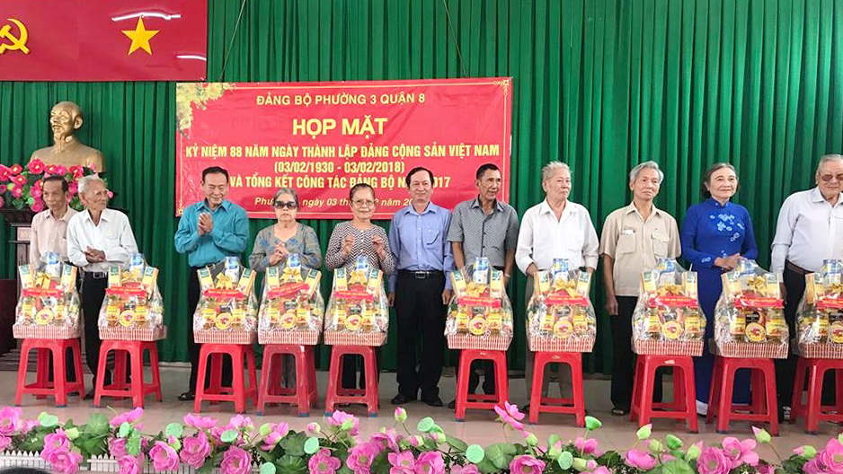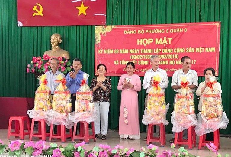 Đ/c: Hà Văn Lợi – UV Thường vụ - Trưởng ban Tổ chức Quận ủy Quận 8 (bìa phải, thứ sáu) trao quà tết cho các Đảng viên.
