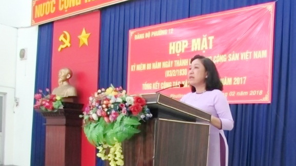 Sáng ngày 01/02/2018, Đảng bộ Phường 12 tổ chức họp mặt kỷ niệm 88 năm ngày thành lập Đảng cộng sản Việt Nam, tổng kết công tác xây dựng Đảng và triển khai phương hướng nhiệm vụ năm 2018. Dự hội nghị có đồng chí Ngô Quang Liêm – Phó Trưởng ban Ban Tuyên giáo Quận ủy Quận 8, cùng dự hội nghị còn có các đồng chí lão thành cách mạng, các đồng chí lãnh đạo phường, các ban ngành đoàn thể, cán bộ và đảng viên toàn Đảng bộ.