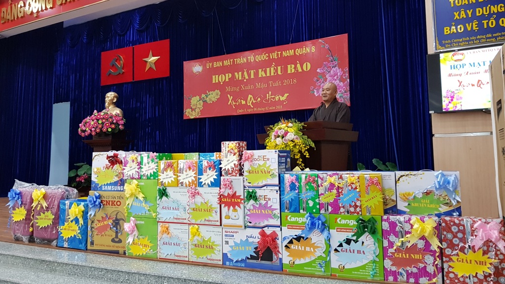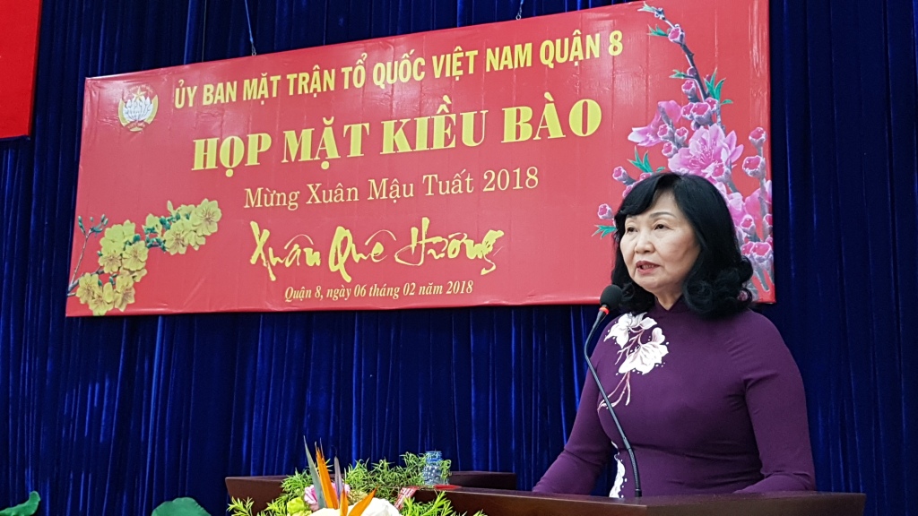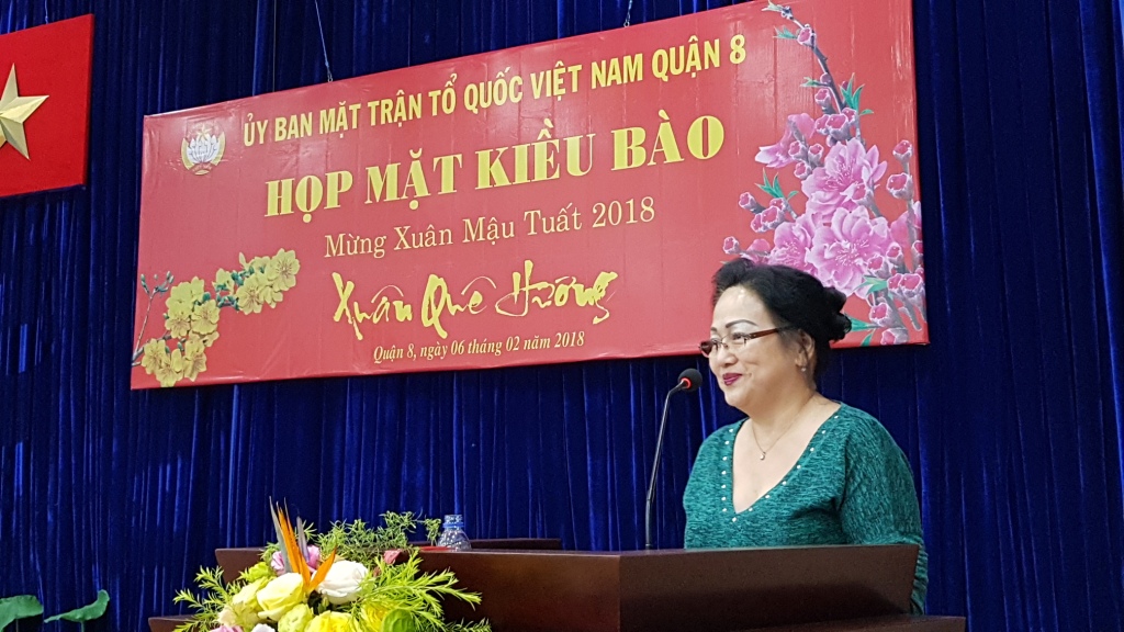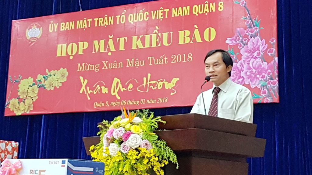 Tại buổi họp mặt, Ông Nguyễn Văn Anh - Nguyên Trưởng Phòng Quản lý xuất nhập cảnh Công an Thành phố Hồ Chí Minh đã phổ biến một số thông tin liên quan đến người Việt Nam ở nước ngoài. Ban Liên lạc kiều bào Quận 8 đã báo cáo hoạt động của Ban Liên lạc kiều bào Quận 8 năm 2017. Thay mặt Ban Thường trực Ủy ban Mặt trận Tổ quốc Việt Nam Quận 8, Bà Huỳnh Kim Chi - Chủ tịch Ủy ban Mặt trận Tổ quốc Việt Nam Quận 8 chúc Tết kiều bào Quận 8 tham dự buổi họp mặt và mong rằng kiều bào tiếp tục giới thiệu, quảng bá hình ảnh, đất nước, con người Việt Nam đến với bạn bè trên thế giới, đồng thời cùng với thân nhân đang cư ngụ tại Việt Nam tập trung đầu tư, phát triển sản xuất - kinh doanh và tham gia các hoạt động từ thiện - xã hội tại địa phương.