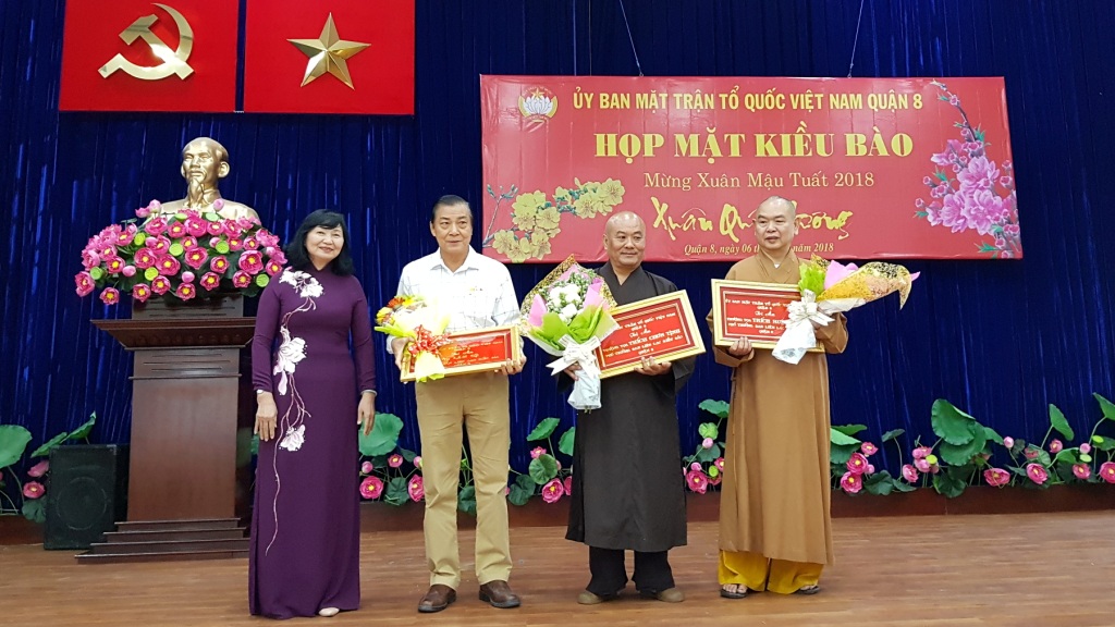 Nhân buổi họp mặt, Ban Thường trực Ủy ban Mặt trận Tổ quốc Quận 8 đã trao tặng Bảng tri ân cho Ban Liên lạc kiều bào Quận 8 đã có những đóng góp xuất sắc trong công tác kiều bào Quận 8 năm 2017.