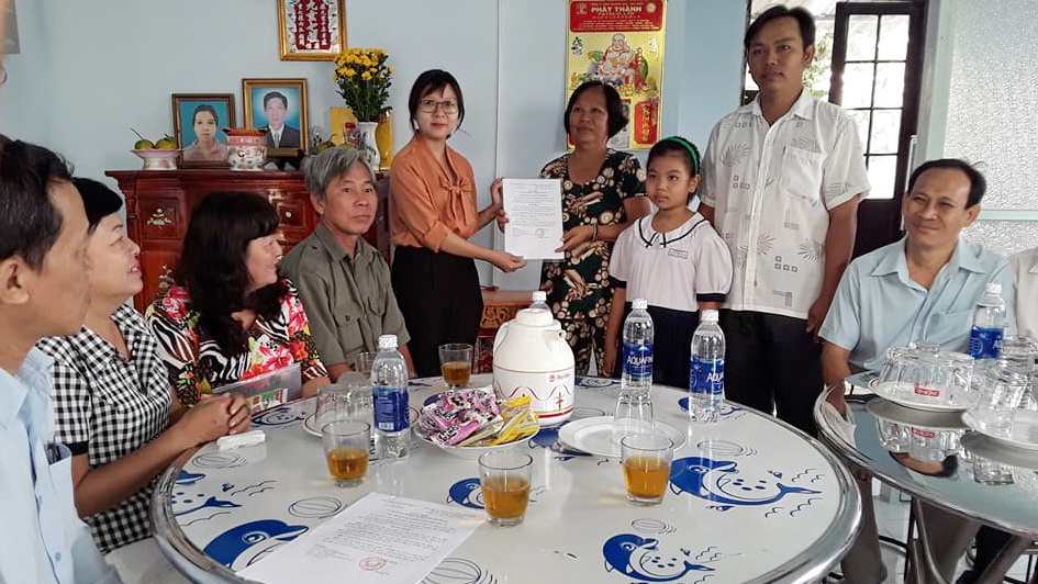 Bà Ngô Thị Trúc Giang - Đảng ủy viên - Phó Chủ tịch UBND Phường 15 trao quyết định hỗ trợ kinh phí xây dựng nhà tình thương.