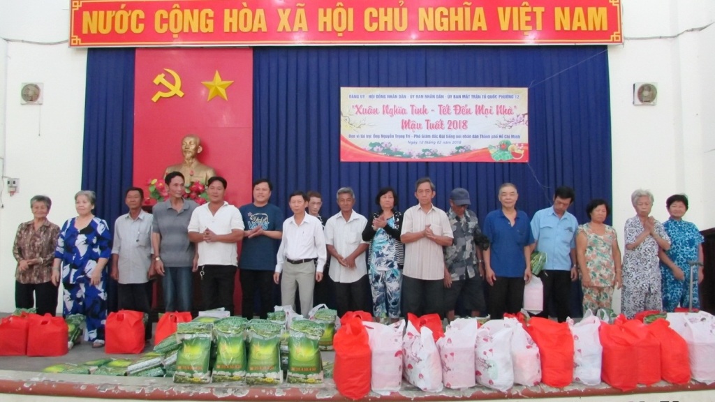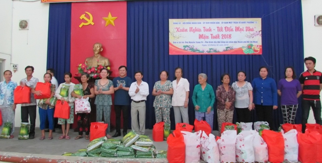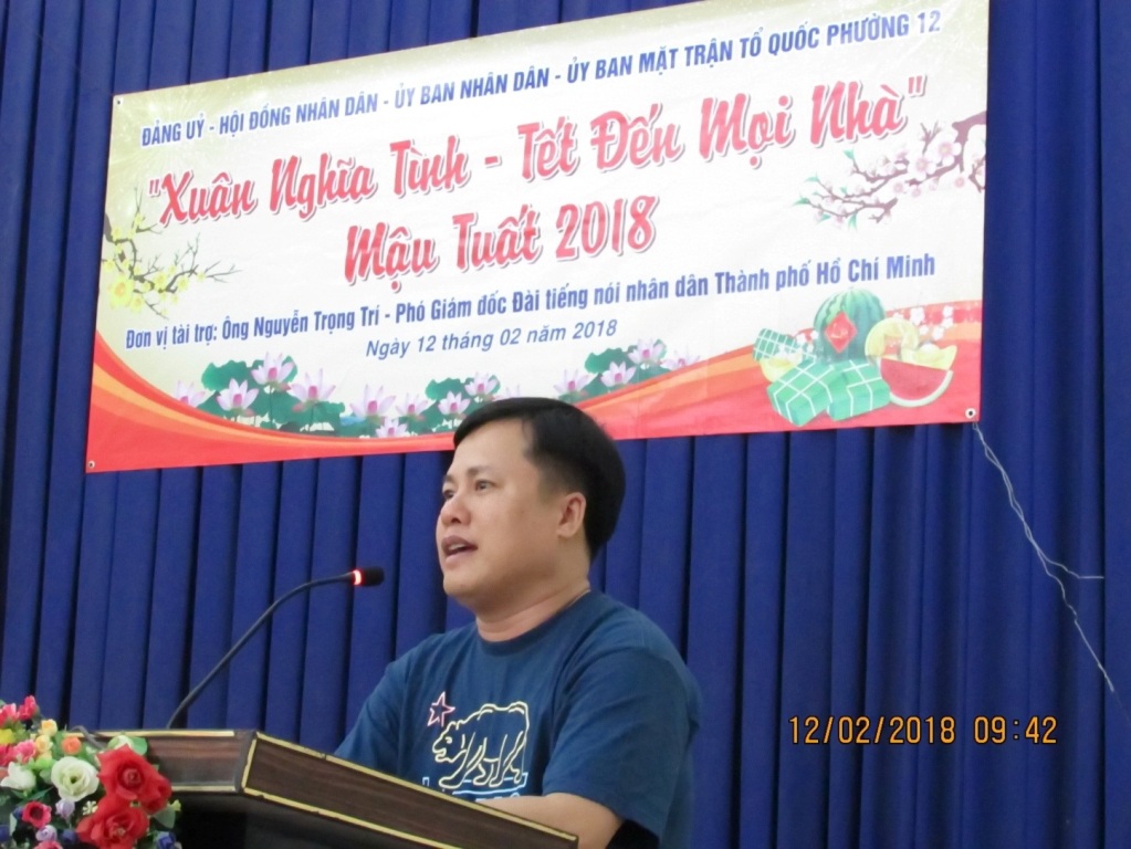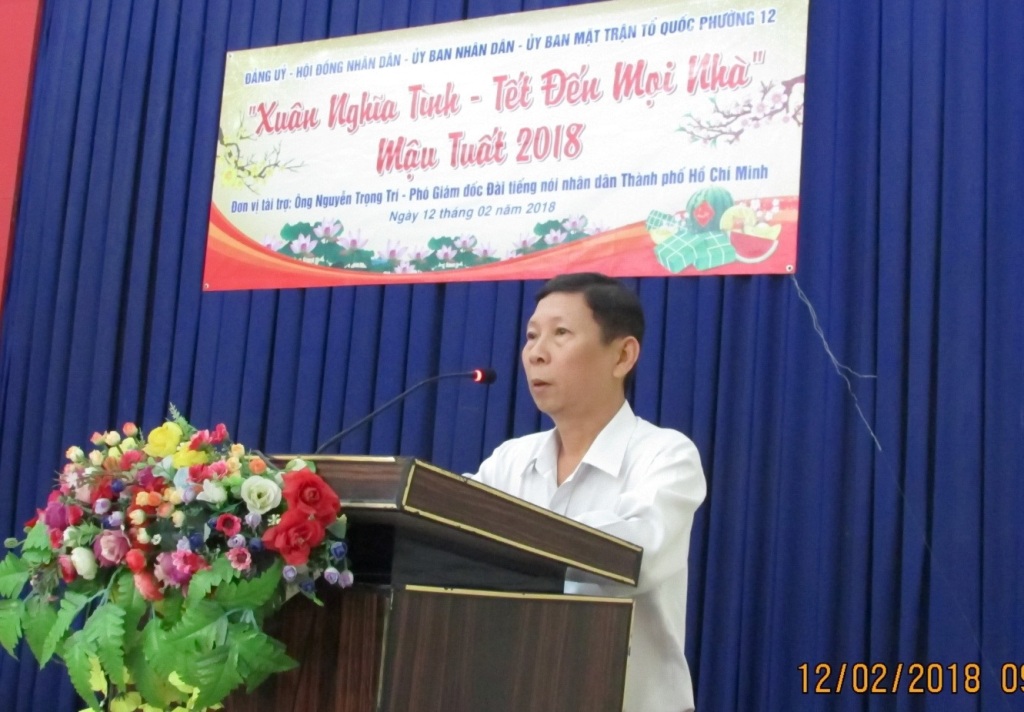 Trong không khí vui tươi, đầm ấm chuẩn bị đón chào tết Nguyên đán Mậu Tuất năm 2018 ông Nguyễn Phước Hùng – Phó Bí thư thường trực Đảng ủy phường 12 đại diện cho Đảng ủy - HĐND - UBND – UB.MTTQ và bà con nghèo trên địa bàn phường gửi lời cảm ơn đến ông Nguyễn Trong Trí – Phó Giám đốc Đài tiếng nói nhân dân TP.HCM lời chúc mừng năm mới tốt đẹp nhất và mong muốn đơn vị tài trợ tiếp tục đồng hành cùng chính quyền địa phương trong công tác chăm lo và giúp đỡ các hộ dân nghèo trên địa bàn phường có điều kiện vui xuân đón tết.