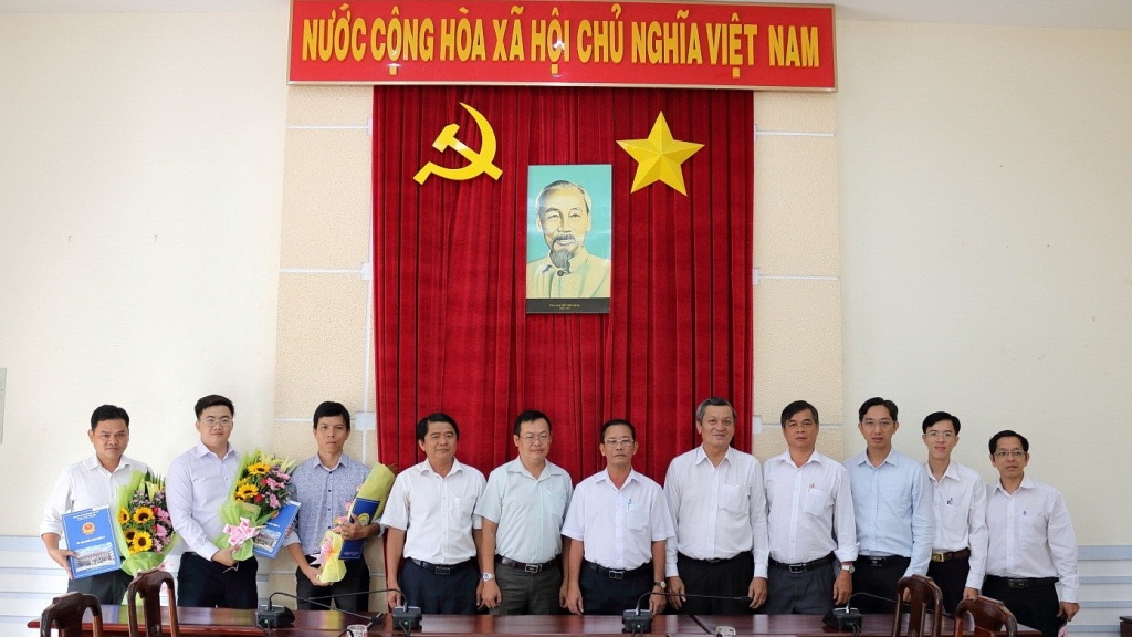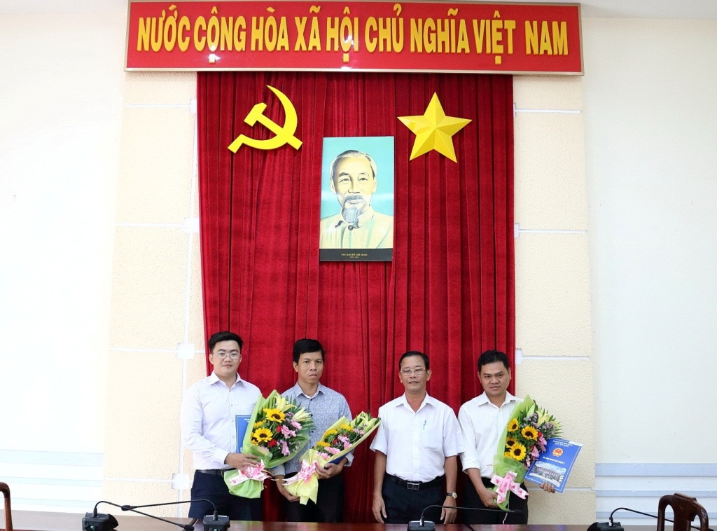 Đ/c Trần Quang Thảo, Phó Bí thư Quận ủy, Chủ tịch Ủy ban nhân dân Quận 8 tặng hoa và trao Quyết định cho các đồng chí được điều động (từ trái sang: đ/c Bùi Trung Trực, đ/c Nguyễn Thanh Phong, đ/c Võ Duy Minh)