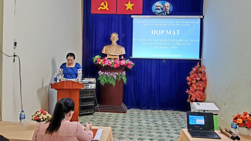 Chiều ngày 08 tháng 3 năm 2018, tại hội trường Ủy ban nhân dân phường 11 đã diễn ra buổi họp mặt kỷ niệm 1978 năm khởi nghĩa Hai Bà Trưng và 108 năm ngày Quốc Tế Phụ Nữ 8/3 (8/3/1910- 8/3/2018) do Công đoàn cơ sở ủy ban nhân dân, Hội Liên hiệp phụ nữ, Ban Vì sự tiến bộ phụ nữ Phường 11 phối hợp tổ chức.
