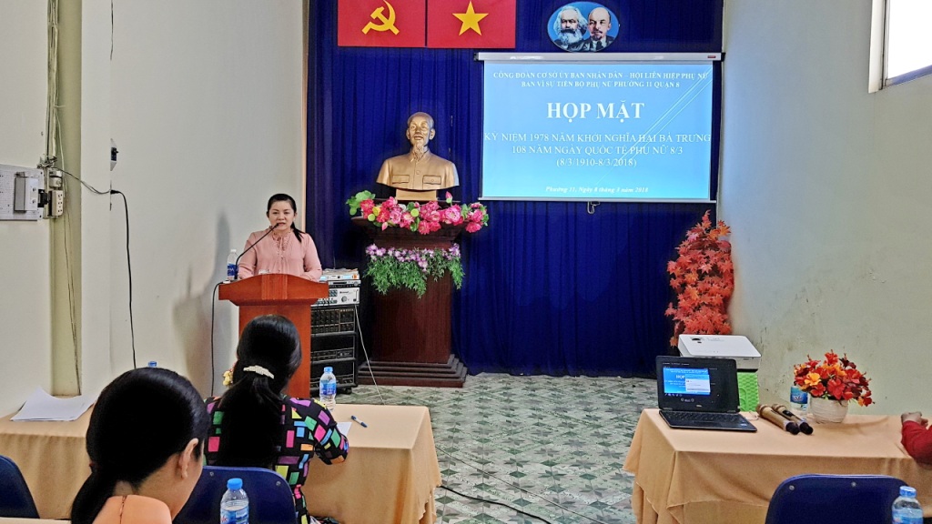 Bà Nguyễn Thị Thanh Xuân – Chủ tịch Hội Liên hiệp Phụ nữ Phường 11 ôn lại truyền thống kỷ niệm 1978 năm Khởi nghĩa Hai Bà Trưng và 108 năm ngày Quốc tế Phụ nữ 8/3 (08/3/1910 – 08/3/2018).