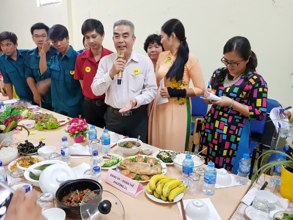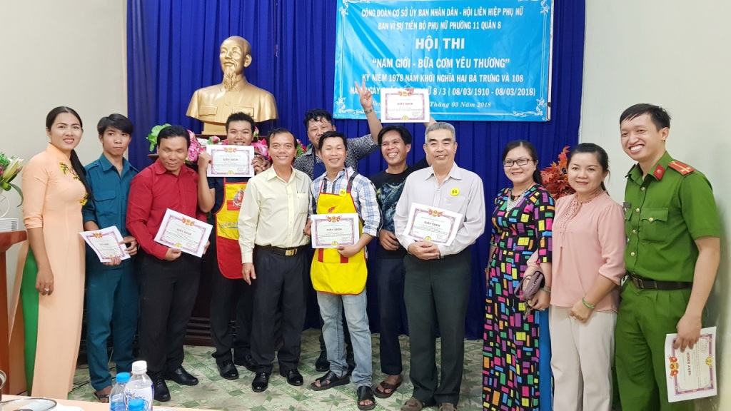 Đặc biệt nội dung được các chị em mong đợi trong buổi họp mặt là Hội thi nam giới trổ tài nấu ăn với chủ đề “Nam giới – Bữa cơm yêu thương”. Hội thi thu hút sự tham gia của 07 đội dự thi gồm: khu phố 1, khu phố 2, khu phố 3, công an Phường 11, Quân sự Phường 11, Đảng ủy – Đoàn thể Phường 11, Ủy ban nhân dân Phường 11. Sau hơn 30 phút làm việc “căng thẳng” ban giám khảo cũng đã chọn ra các đội đạt giải như sau: