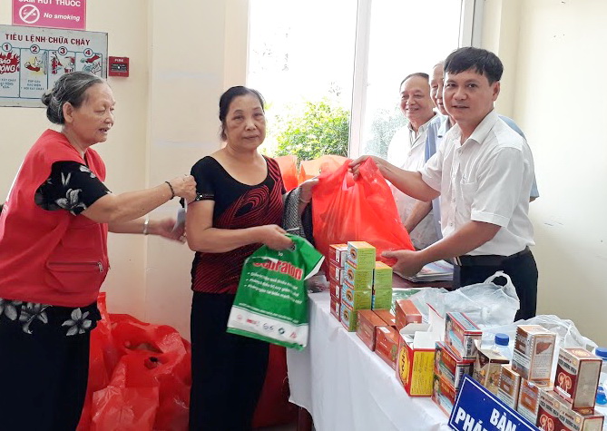 Quang cảnh buổi khám bệnh, cấp thuốc miễn phí và tặng quà cho người cao tuổi, người nghèo