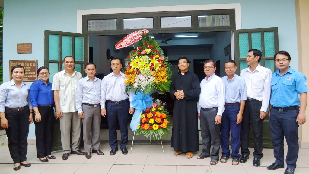 Ông Ngô Thành Tuấn - Bí thư Quận ủy Quận 8 tặng hoa chúc mừng Linh mục Trần Quang Tung - Hạt phó Hạt Bình An, Chánh xứ Nam Hải.