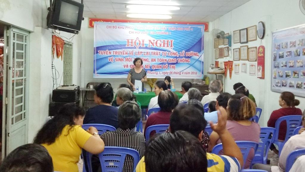 Để lập thành tích chào mừng chào mừng kỷ niệm 43 năm Ngày giải phóng miền Nam, thống nhất đất nước (30/4/1975 - 30/4/2018) và 132 năm Ngày Quốc tế Lao động (1/5/1886 - 1/5/2018), Cấp ủy – Ban công tác Mặt trận khu phố 4, phối hợp Chi hội Luật gia Phường 1 tổ chức Hội nghị tuyên truyền lập lại trật tự lòng, lề đường, vệ sinh môi trường; an toàn giao thông và giữ gìn mỹ quan đô thị. Được tổ chức tối ngày 6 tháng 4 năm 2018 tại trụ sở Ban điều hành khu phố 4; đến tham dự hội nghị về phía lãnh đạp phường có bà Hoàng Thị Hải Vi – Đảng ủy viên – Chủ tịch Uỷ ban MTTQ Việt Nam Phường 1; về phía khu phố có bà Phùng Thị Liễu – Bí thư chi bộ khu phố - Trưởng ban Công tác Mặt trận khu phố 4 đồng thời là báo cáo viên của chương trình; cùng các ban ngành đoàn thể khu phố và Nhân dân trên địa bàn khu phố đến tham dự hội nghị./.