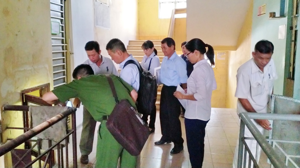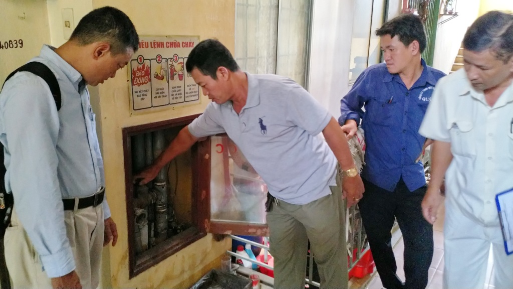 Đoàn kiểm tra kiểm tra các họng chữa cháy tại các tầng của chung cư Bình Đăng.