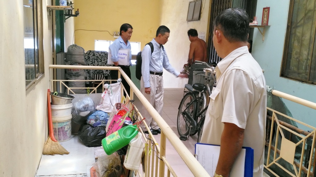 Đoàn kiểm tra nhắc nhở người dân để đồ đạc, vật dụng cá nhân gọn gàng, không lấn chiếm hành lang chung cư.
