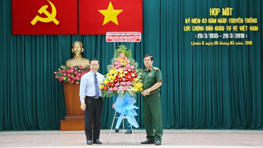 Sáng ngày 28/3/2018, tại Hội trường Văn hóa - Ủy ban nhân dân Quận 8, Quận ủy - Ủy ban nhân dân - Ủy ban Mặt trận Tổ quốc Việt Nam Quận 8 tổ chức Họp mặt kỷ niệm 83 năm ngày truyền thống Dân quân tự vệ Việt Nam (28/3/1935 - 28/3/2018). Tham dự buổi Họp mặt có đ/c Ngô Thành Tuấn - Bí thư Quận ủy, Chủ tịch HĐND Quận 8, đ/c Trương Hạ Long - Phó Chủ tịch UBND Quận 8, các đ/c trong Ban Thường vụ Quận ủy, Thường trực HĐND, Thường trực UBND, UBMTTQVN Quận 8; đại diện các ban, ngành, đoàn thể Quận 8, 16 phường và 368 đ/c là cán bộ chiến sĩ đại diện cho hơn 3.000 lực lượng Dân quân tự vệ Quận 8.