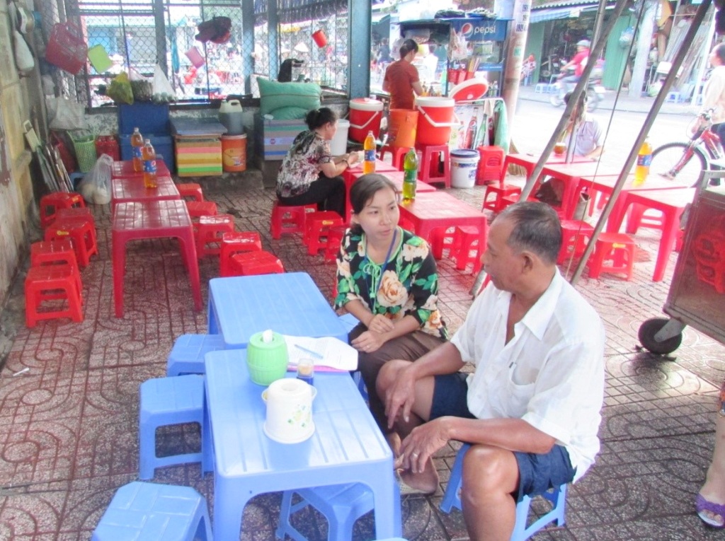 Ông Bùi Hồng Phăng – Chủ tịch Hội Cựu chiến binh phường tuyên truyền tại góc hẻm104 Mạc Vân và 121 Tuy Lý Vương ngày 13/4/82018