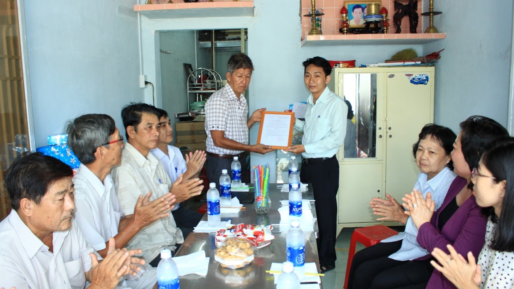 Ông Lương Vĩnh Cường, Phó Chủ tịch UBND Phường 10 trao quyết định trao nhà tình thương cho gia đình.