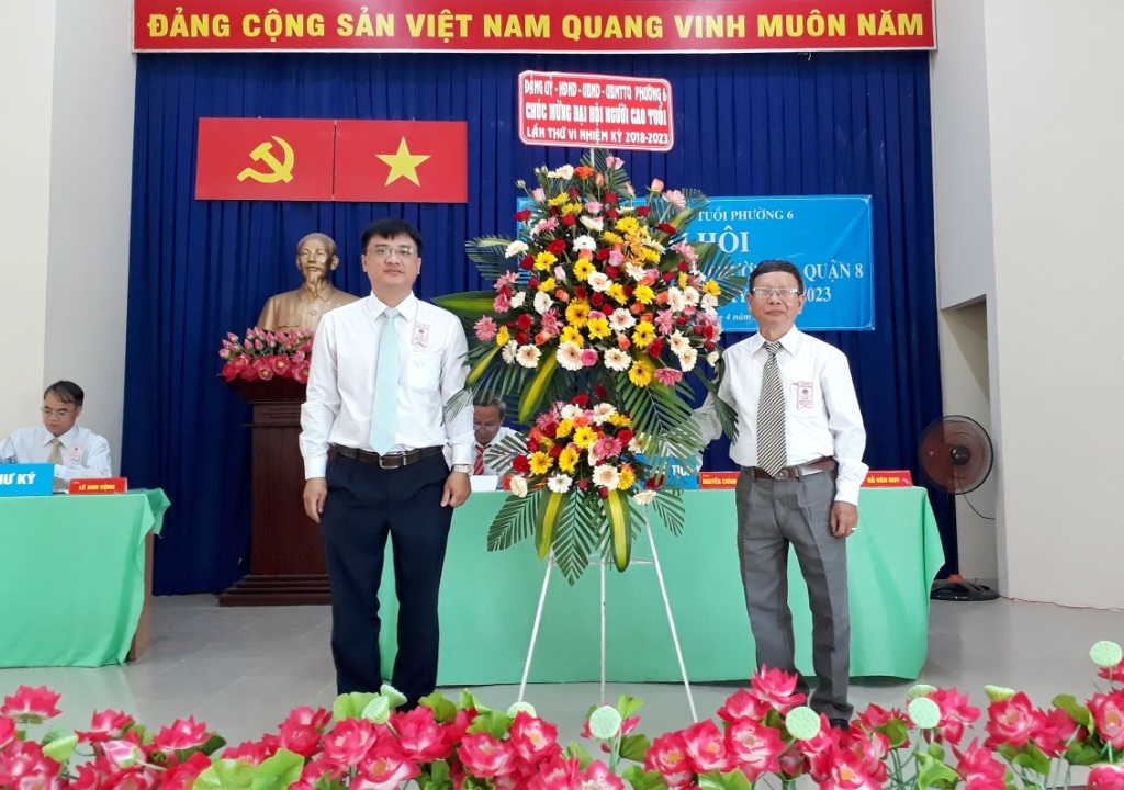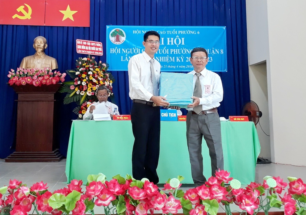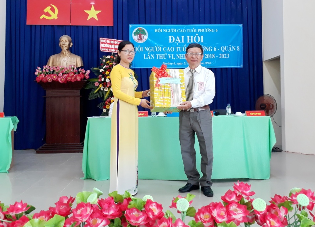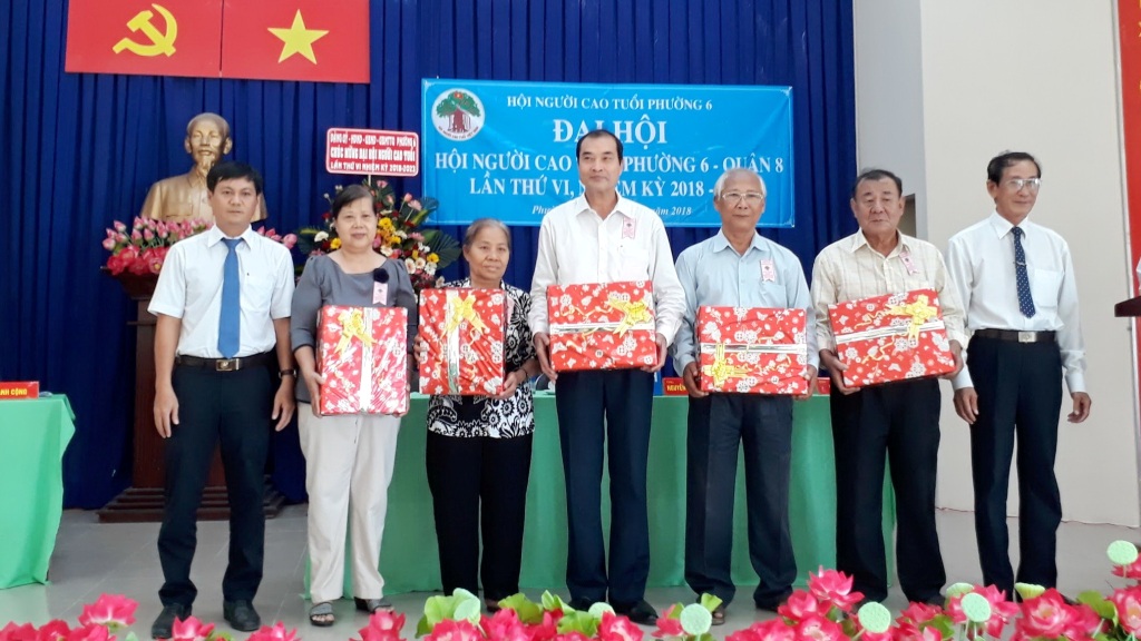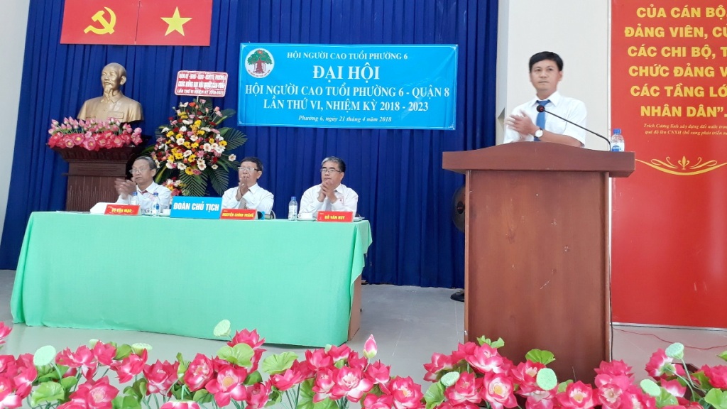 Sáng 21/4, Hội Người cao tuổi Phường 6 long trọng tổ chức Đại hội Hội Người cao tuổi lần thứ VI, nhiệm kỳ 2018-2023. Đến tham dự Đại hội có các đồng chí: Lê Kiến Hiệp, Trưởng Ban đại diện Hội Người cao tuổi quận; Trần Văn Dũng, chuyên viên Phòng Nội vụ; Nguyễn Quang Huy, Quận ủy viên, Bí thư Đảng ủy, Chủ tịch HĐND phường; Nguyễn Xuân Tuấn, Phó Bí thư Đảng ủy, Chủ tịch UBND phường; Vũ Thị Kim Dung, Đảng ủy viên, Phó Chủ tịch HĐND phường; Thái Trần Trọng Nghĩa, Đảng ủy viên, Chủ tịch Ủy ban MTTQ phường; Bí thư, Trưởng ban điều hành 6 khu phố và 100 hội viên Hội Người cao tuổi phường.