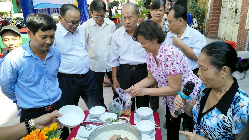 Ông Nguyễn Quang Huy (bìa trái) – Quận ủy viên, Bí thư Đảng ủy, Chủ tịch Hội đồng nhân dân Phường 6 đang chấm điểm phần thi nấu ăn của Khu phố 1