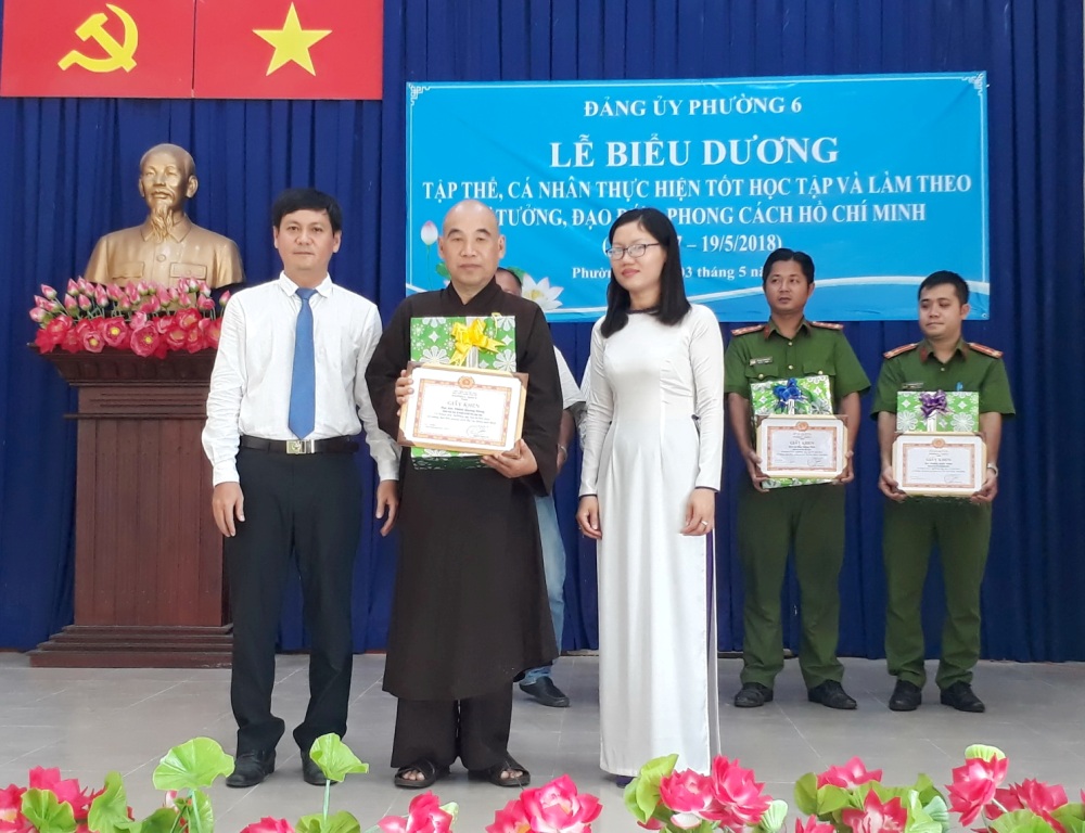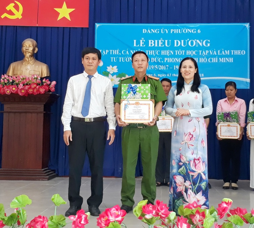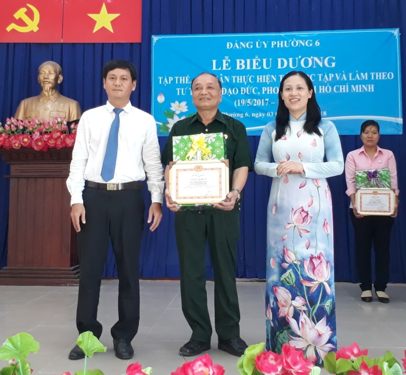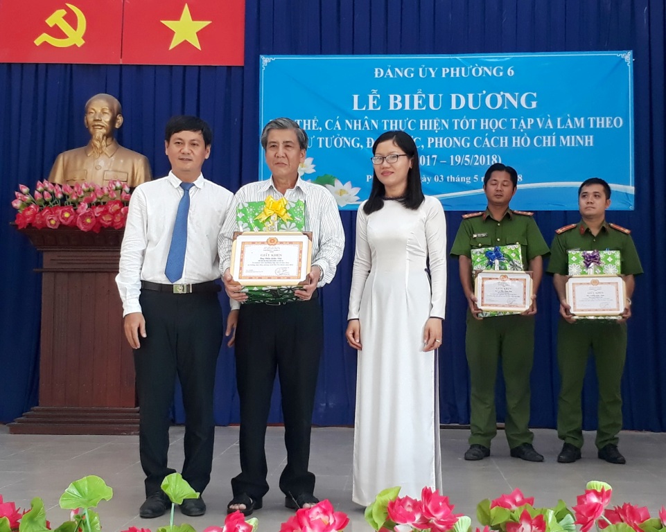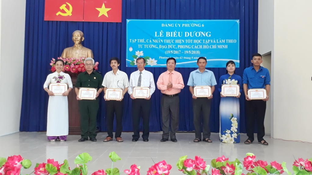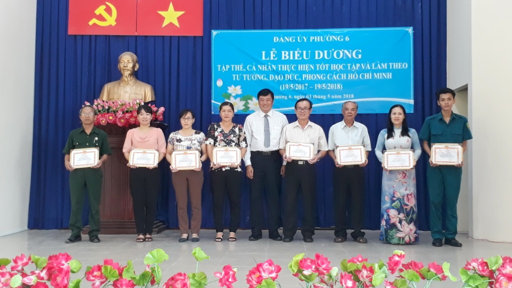 Sáng 03/5/2018, Đảng ủy Phường 6 tổ chức Lễ biểu dương gương điển hình “Học tập và làm theo tư tưởng, đạo đức, phong cách Hồ Chí Minh” năm 2018. Tham dự lễ biểu dương có các đồng chí: Phạm Ngọc Muôn, Ủy viên Ban Thường vụ, Trưởng Ban Dân vận Quận ủy; Trương Công Hồ, Quận ủy viên, Phó Trưởng Ban thường trực Ban Tuyên giáo Quận ủy; Nguyễn Quang Huy, Quận ủy viên, Bí thư Đảng ủy phường; Mai Thị Thảo Vi, Phó Bí thư thường trực Đảng ủy; Vũ Thị Kim Dung, Đảng ủy viên, Phó Chủ tịch Hội đồng nhân dân phường; Võ Đoàn Thư, Đảng ủy viên, Phó Chủ tịch UBND phường,...