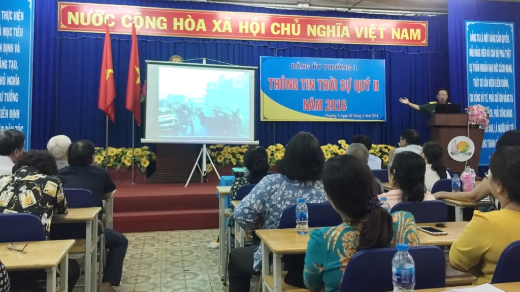 Thực hiện Kế hoạch số 131-KH/ĐU ngày 03 tháng 5 năm 2018 của Đảng uỷ Phường 1 về tổ chức nghe thông tin thời sự Qúy II năm 2018. Vào lúc 14 giờ 00 ngày 9 tháng 5 năm 2018 tại Hội trường Uỷ ban nhân dân Phường 1; đã diễn ra buổi thông tin thời sự Qúy II năm 2018; đến tham Hội nghị có Đại tá Nguyễn Nhứt – báo cáo viên Ban Tuyên giáo Trung ương đồng thời là báo cáo viên của Hội nghị; về phía lãnh đạo phường có đồng chí Lê Văn Tám – Bí thư Đảng uỷ; Chủ tịch HĐND phường; đồng chí Nguyễn Văn Đại – Phó bí thư Thường trực Đảng uỷ phường; đồng chí Hoàng Thị Hải Vi - Đảng uỷ viên – Chủ tịch Uỷ ban MTTQ Việt Nam Phường 1, cùng các đồng chí đảng uỷ viên, các đồng chí đại diện các ban ngành đoàn thể phường, cấp uỷ 11 chi bộ trực thuộc và lực lượng nòng cốt phường cùng đến tham dự./.