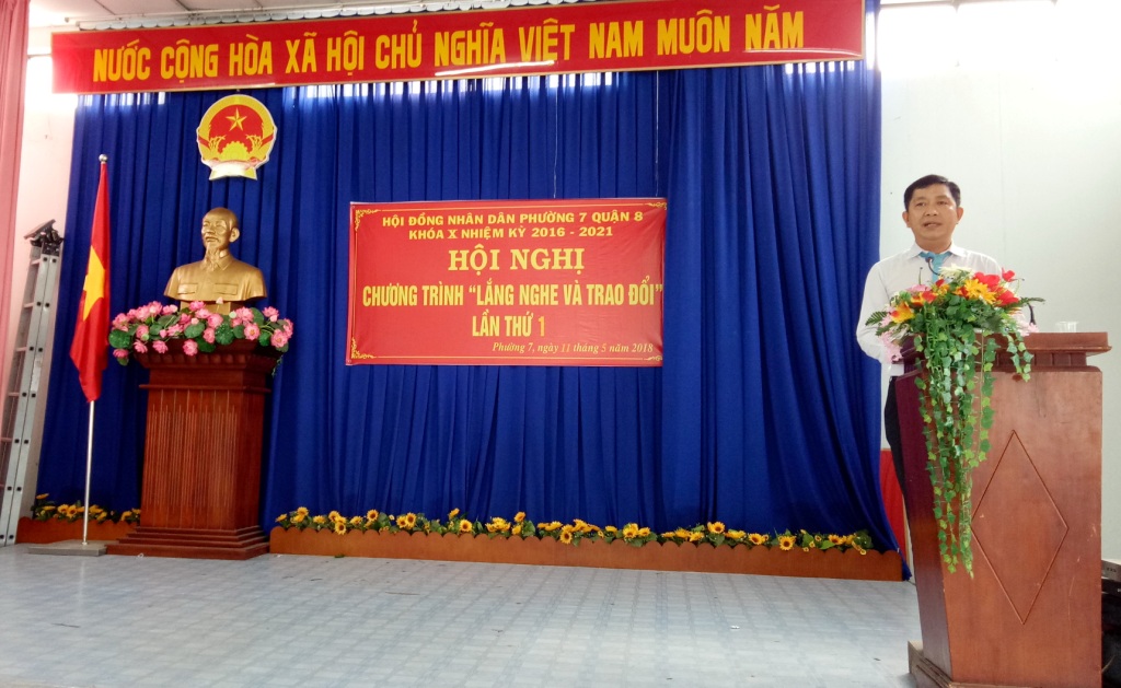 Sáng ngày 11 tháng 5 năm 2018 tại Hội trường Nhà Văn hóa Phường 7. Hội đồng Nhân dân Phường 7 tổ chức Hội nghị “Lắng nghe và trao đổi”, nhằm thực hiện chức năng nhiệm vụ của Hội đồng Nhân dân, các đại biểu HĐND phường là cầu nối giữa chính quyền địa phương, kịp thời giải quyết các vấn đề mà cử tri quan tâm, bức xúc phản ánh, đồng thời qua Hội nghị “ Lắng nghe và trao đổi” là dịp để cử tri ở 06 khu phố của phường bày tỏ tâm tư nguyện vọng của cử tri về những vấn đề liên quan đến quyền lợi hợp pháp, chính đáng của mình. Đây cũng là dịp để lãnh đạo chính quyền phường lắng nghe, ghi nhận, giải trình, trao đổi, cung cấp những thông tin có liên quan và giải quyết nhanh những kiến nghị thuộc thẩm quyền của phường.