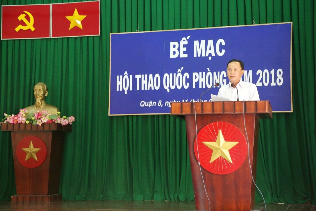 Đ/c Nguyễn Thanh Sang - QUV, Phó Chủ tịch Ủy ban nhân dân Quận 8, Trưởng Ban Chỉ đạo Hội thao Quốc phòng Quận 8 phát biểu Bế mạc Hội thao Quốc phòng năm 2018
