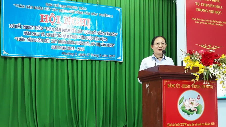 Chiều ngày 07/5/2018, tại Hội trường Ủy ban nhân dân Phường 2, Ban Chỉ đạo phong trào “Toàn dân đoàn kết xây dựng đời sống văn hóa” Phường 2 tổ chức sơ kết phong trào “Toàn dân đoàn kết xây dựng đời sống văn hóa” năm 2017 và sơ kết 02 năm thực hiện cuộc vận động “Toàn dân đoàn kết xây dựng nông thôn mới, đô thị văn minh” giai đoạn (2016 - 2020). Đến dự có Bà Trần Thị Thu Trang, Ủy viên Ban Thường vụ Quận ủy, Trưởng phòng Văn hóa - Thông tin Quận 8; ông Phạm Ngọc Xuân Ninh - Ủy viên Thường trực Ủy ban Mặt trận Tổ quốc Việt Nam Quận 8; Ông Lê Văn Hậu, Quận ủy viên, Bí thư Đảng ủy Phường 2; ông Hồ Thanh Bình - Phó Bí thư Đảng ủy, Chủ tịch UBND, Trưởng Ban Chỉ đạo Phường 2; ông Lê Thanh Tú - Ủy viên Thường vụ Đảng ủy, Chủ tịch UB.MTTQ, Phó Ban Chỉ đạo Phường 2; bà Đoàn Thị Thanh Tuyền - Đảng uỷ viên, Phó Chủ tịch UBND, Phó ban Chỉ đạo Phường 2.