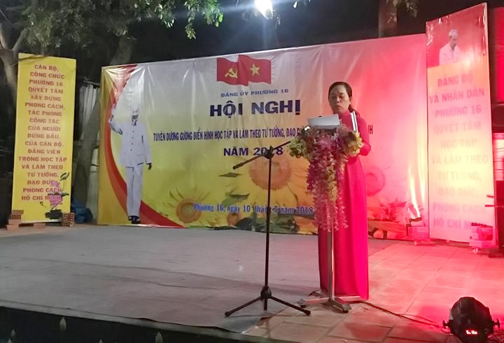 Tối 10/5, tại trụ sở UBND, Đảng ủy Phường 16 tổ chức Hội nghị tuyên dương gương điển hình học tập và làm theo tư tưởng, đạo đức, phong cách Hồ Chí Minh năm 2018. Đến dự hội nghị có đồng chí Nguyễn Thanh Xuân, Phó Bí thư Quận ủy; đồng chí Ngô Quang Liêm, Phó Trưởng ban Ban Tuyên giáo Quận ủy; đồng chí Lê Minh Thông, Quận ủy viên, Bí thư Đảng ủy; đồng chí Huỳnh Thị Anh Minh, Phó Bí thư Thường trực Đảng ủy, Chủ tịch Hội đồng nhân dân; các đồng chí Đảng ủy viên; các đồng chí Thường trực HĐND, UBND; đại diện Ban Chỉ huy Công an, Ban Chỉ huy Quân sự, Mặt trận và các đoàn thể phường; đại diện cấp ủy các chi bộ trực thuộc, khu phố, tổ dân phố; các gương điển hình được tuyên dương.